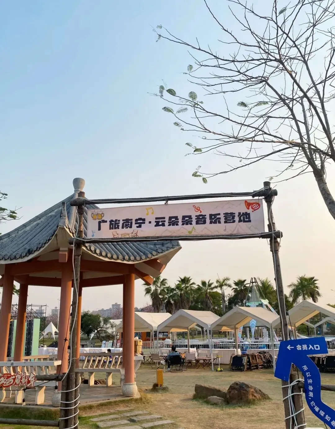 云朵朵营地在广西美术馆与“南宁之夜”之间。运营方将闲置绿地变成绿茵草坪。这里搭建了野奢帐篷、露天舞台和艺术区。