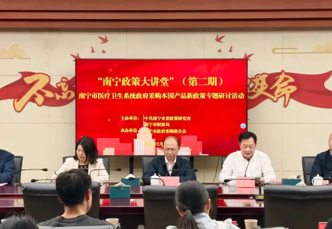 3月20日,为深入贯彻落实《国务院办公厅关于在政府采购中实施本国产品标准及相关政策的通知》精神,推动本国产品标准及相关政策落地见效,提升行业政策理解与实务操作能力,由南宁市委政研室、市财政局联合主办,南宁市政府采购联合会承办的“南宁政策大讲堂”(第二期)——医疗卫生系统政府采购本国产品新政策专题研讨活动圆满举办。市委副秘书长、市委政研室主任梁智忠,市财政局党组书记、局长吴厦出席活动并致辞。