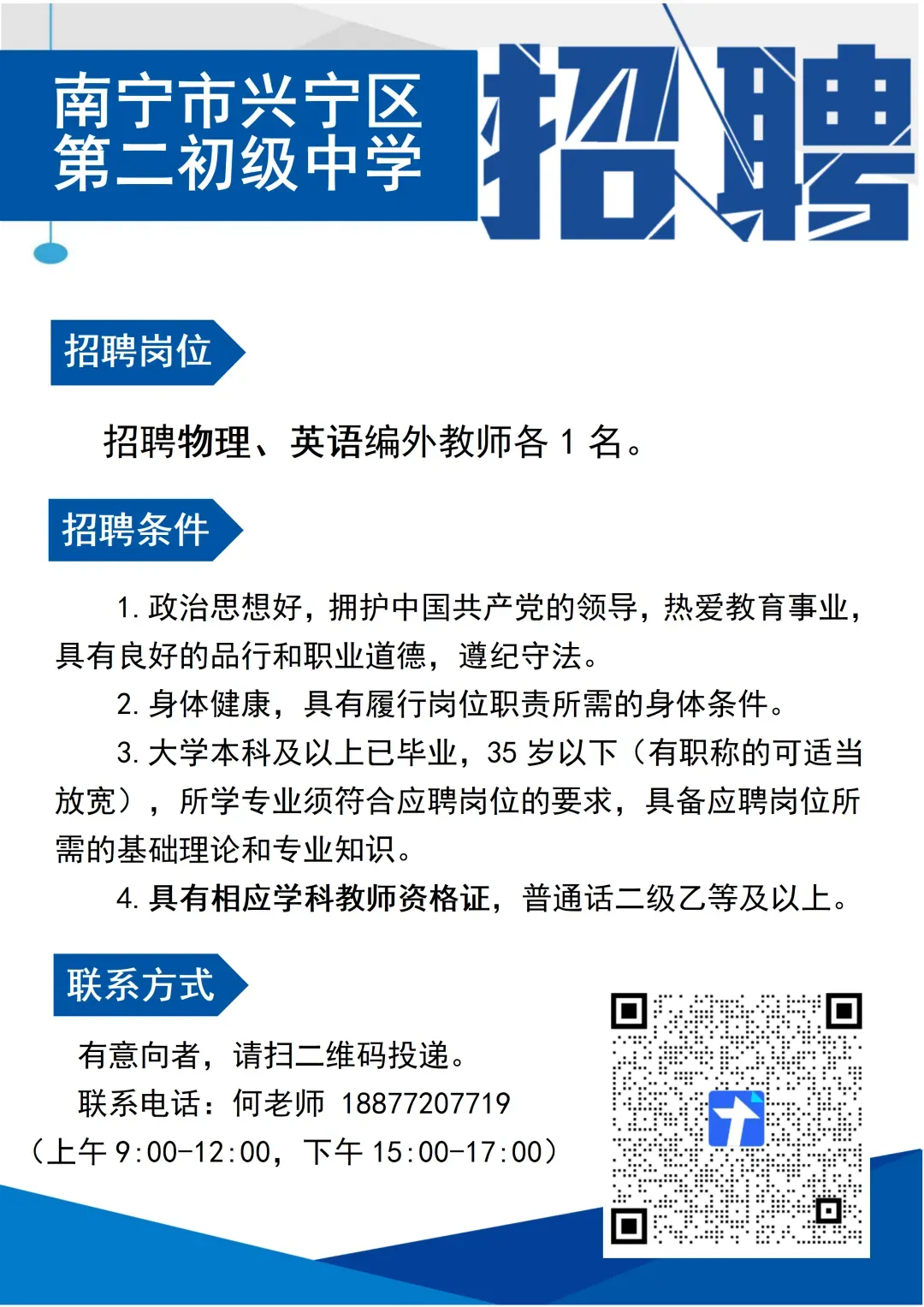 【教师招聘】诚招物理、英语编外教师,南宁市兴宁区第二初级中学欢迎您的加入!