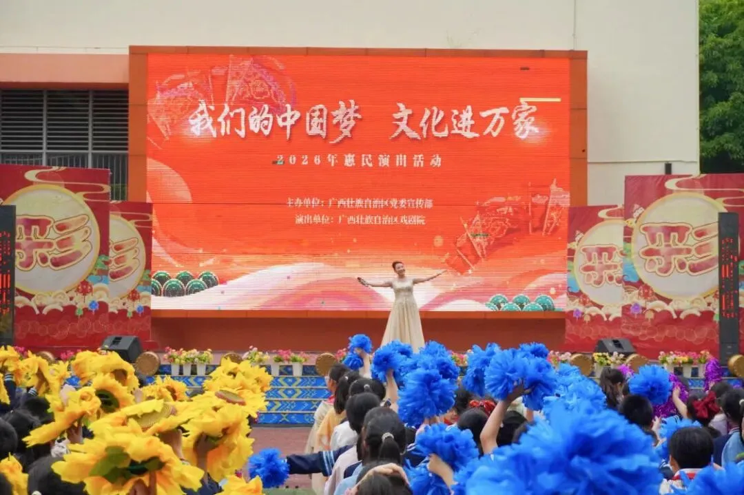 互动环节趣味再升级,精彩接踵而至。彩调剧团的老师邀请孩子们登上舞台,手把手教学甩绢花、舞扇子等经典戏曲基本功。孩子们认真模仿,举手投足间一招一式学得有模有样,欢声笑语萦绕全场。随后,女声独唱《我们的祖国》响起,清亮的歌声唱出了生活的甜蜜与对祖国的热爱。