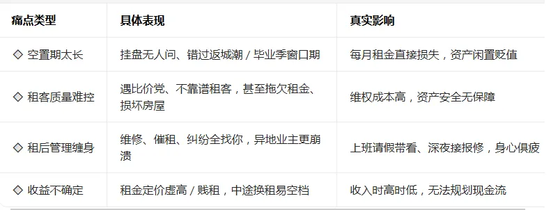 在这样的市场里,自己出租的痛点几乎人人都逃不过,每一个都能拖垮心态👇