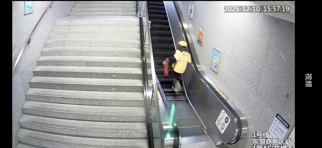 外卖小哥李济崇飞奔到地铁站,提着灭火器折返现场。 (视频截图)
