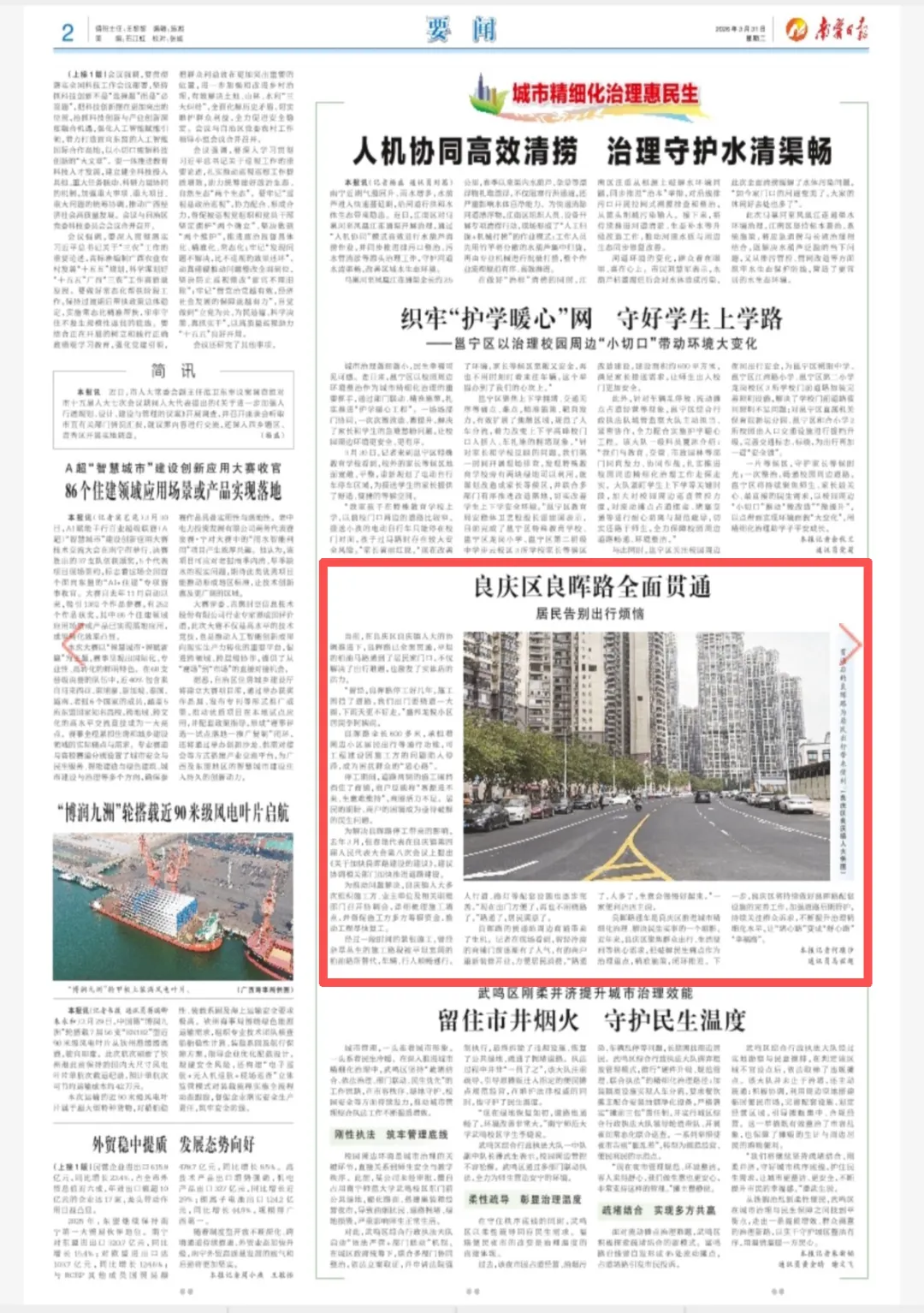 良晖路通车是良庆区推进城市精细化治理、解决民生实事的一个缩影。近年来,良庆区聚焦群众出行、生活便利等核心需求,把破解民生痛点作为治理重点,精准施策,闭环推进。下一步,良庆区将持续做好良晖路配套设施的完善工作,加强道路后期管护,持续关注群众诉求,不断提升治理精细化水平,让“堵心路”变成“舒心路”“幸福路”。