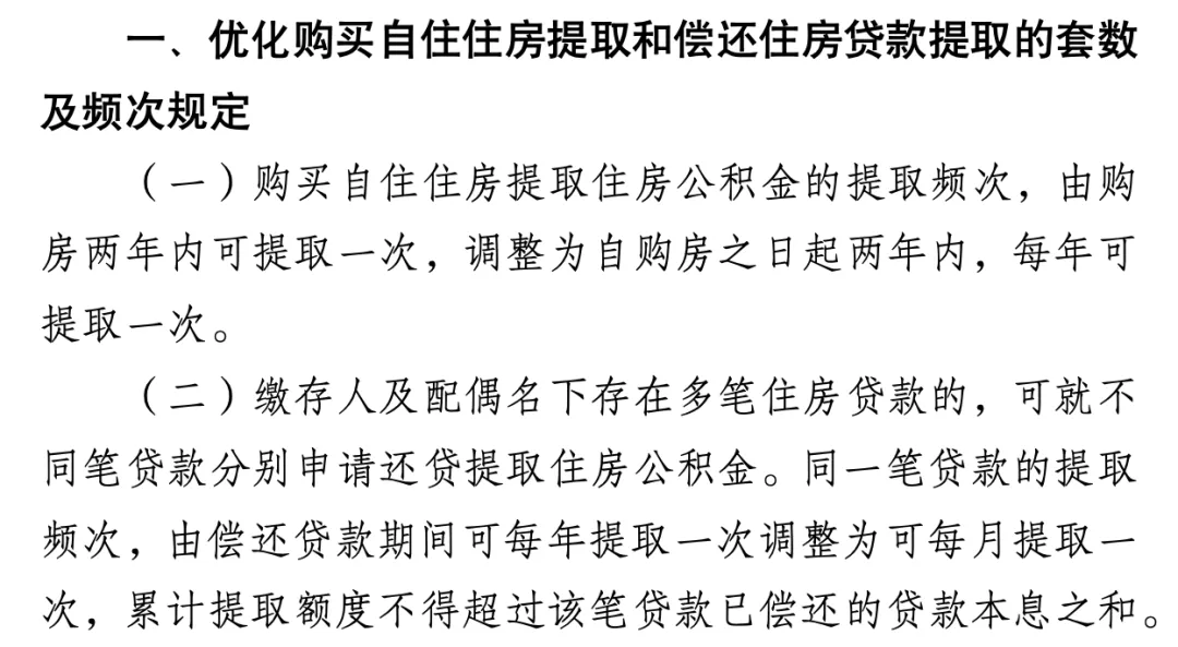 ①购买自住住房提取住房公积金的提取频次,由购房两年内可提取一次,调整为自购房之日起两年内,每年可提取一次。