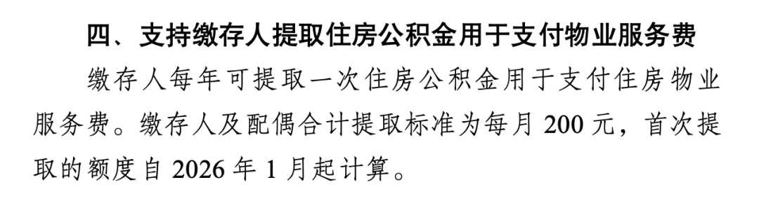 缴存人每年可提取一次住房公积金用于支付住房物业服务费。缴存人及配偶合计提取标准为每月200元,首次提取的额度自2026年1月起计算。