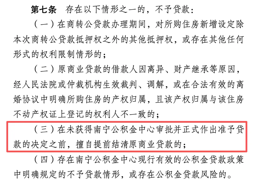 6、原商业贷款尚未结清,且已征得原商业贷款银行同意转为公积金贷款。(如果在未获得南宁公积金中心审批并正式作出准予贷款的决定之前,擅自提前结清原商业贷款,也不符合商转公的条件)。