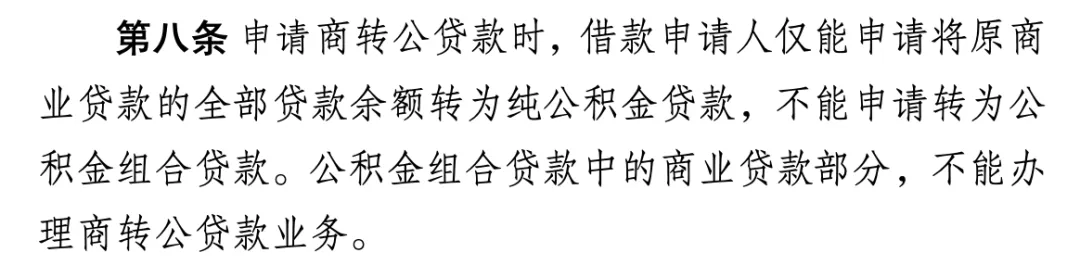 明确了商转公贷款只能办理纯公积金贷款,不能转为组合贷款(即借款申请人仅能申请将原商业贷款的全部贷款余额转为纯公积金贷款,不能申请转为公积金组合贷款。)