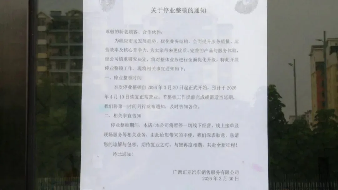 记者来到大伙反映的这家4S店时,店内已无人值守,大门贴着一张停业通知。消费者曲先生告诉记者,他昨天准备提车时,被临时告知了一个让他震惊的消息。
