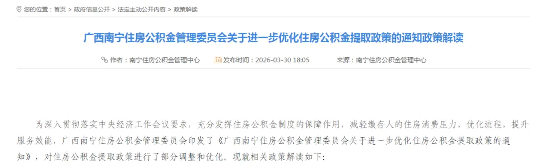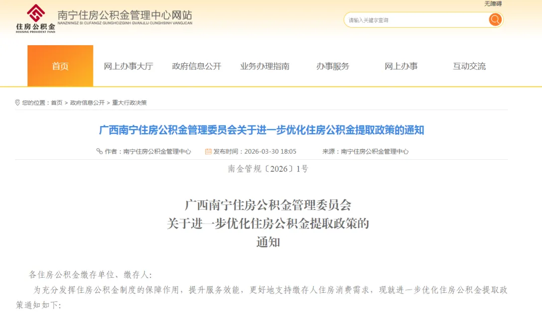 近日(3月30日),南宁住房公积金管理中心网站发布【广西南宁住房公积金管理委员会《关于进一步优化住房公积金提取政策》的通知】,主要涉及四大优化调整: