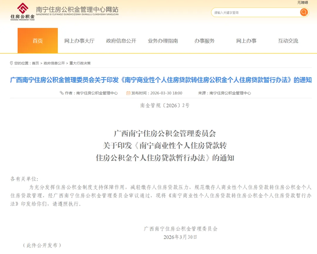 近日(3月30日),南宁住房公积金管理中心网站发布【广西南宁住房公积金管理委员会关于印发《南宁商业性个人住房贷款转住房公积金个人住房贷款暂行办法》的通知】,本办法自2026年5月8日起施行,有效期一年。