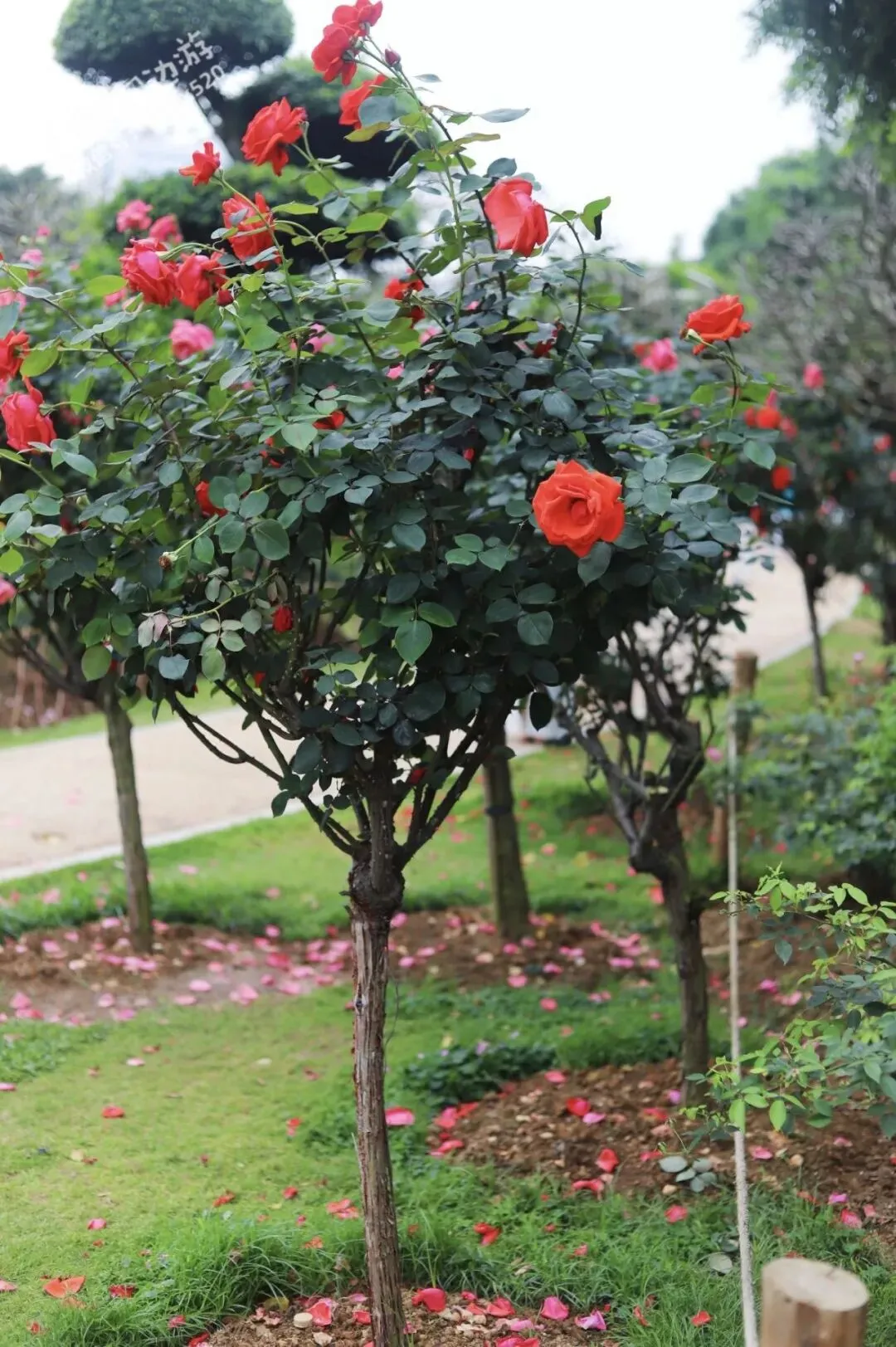 月季植株高大,枝繁叶茂,花朵硕大饱满,宛如一个个盛装出席的贵妇。