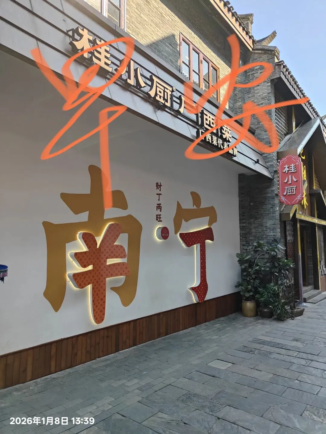 走出青秀山已是中午时分,景区西门滴了一部快车,直奔兴宁区打卡邕州古城“三街两巷”。“三街两巷”是古邕州的发祥地,始建于宋代,“三街”是兴宁路、民生路、解放路三条老街,“两巷”说的是金狮巷、银狮巷两条明清古巷,现在已被打造为南宁赫赫有名的历史文化街区,是到南宁游玩必打卡之地,而且就在闹市,最适合我等这类短期游客。从下车地民生大道入口走进老街区,映入眼帘的首先是万国酒家广场,因为始建于1945年,当年号称万国大饭店的万国酒家而得名。这家店坐拥老街绝佳地带,而且名声响亮,冠以广西老字号、非遗邕菜老友粉传承店等诸多美名,但据网友评价,价格小贵且味道一般,一轮游足以。不过我们一来要解决午饭问题,二来总要见识一下广西名吃老友粉为何许物也,所以决定下榻于此。毕竟是南宁热门景区,虽是淡季,吃客也有7成。我们这次出行关于吃饭有个原则,就是早点品尝小吃,吃个饱;午饭就近快餐垫吧个倒;晚餐挖掘美食,喝个好!所以没上二楼点菜,就在一楼散台用饭。到广西一定是要嗦粉儿的,我们看着菜单点了牛肉老友粉、猪肠老友粉、海鲜老友粉各色米粉。窗口排号取粉,窗口排队添加葱花香菜酸豆角等配料,看似乱中有序,实则确实有些乱,我们的粉就搞错了一份,牛肉变猪杂了。终于上齐了拿对了,坐下开饭。热气蒸腾中,汪涵说的那种酸爽的味道弥漫你的味觉全境,还有些酸臭的赶脚。说句良心话,尚在我能接受范围内,偶尔品尝一下可以体验到些许酸辣爽感。但我同行伙伴就没那么幸运了,捏着鼻子吃了十之二三,哈哈,本山大叔说的好:幸福就是遭罪。算下账平均每人30元左右,在景区用餐不算贵,良心商家。叫来服务员求科普为什么叫老友粉?原来添加了广西特有的酸笋制作的米粉才可以称作老友粉,这种类似螺蛳粉让许多人接受不来的酸臭味道正是这道地方特色美食的身份证啊!我们暗自约定,再进饭店看见菜单上有老友二字的坚决不点,尽管友情万岁也只能辜负了。