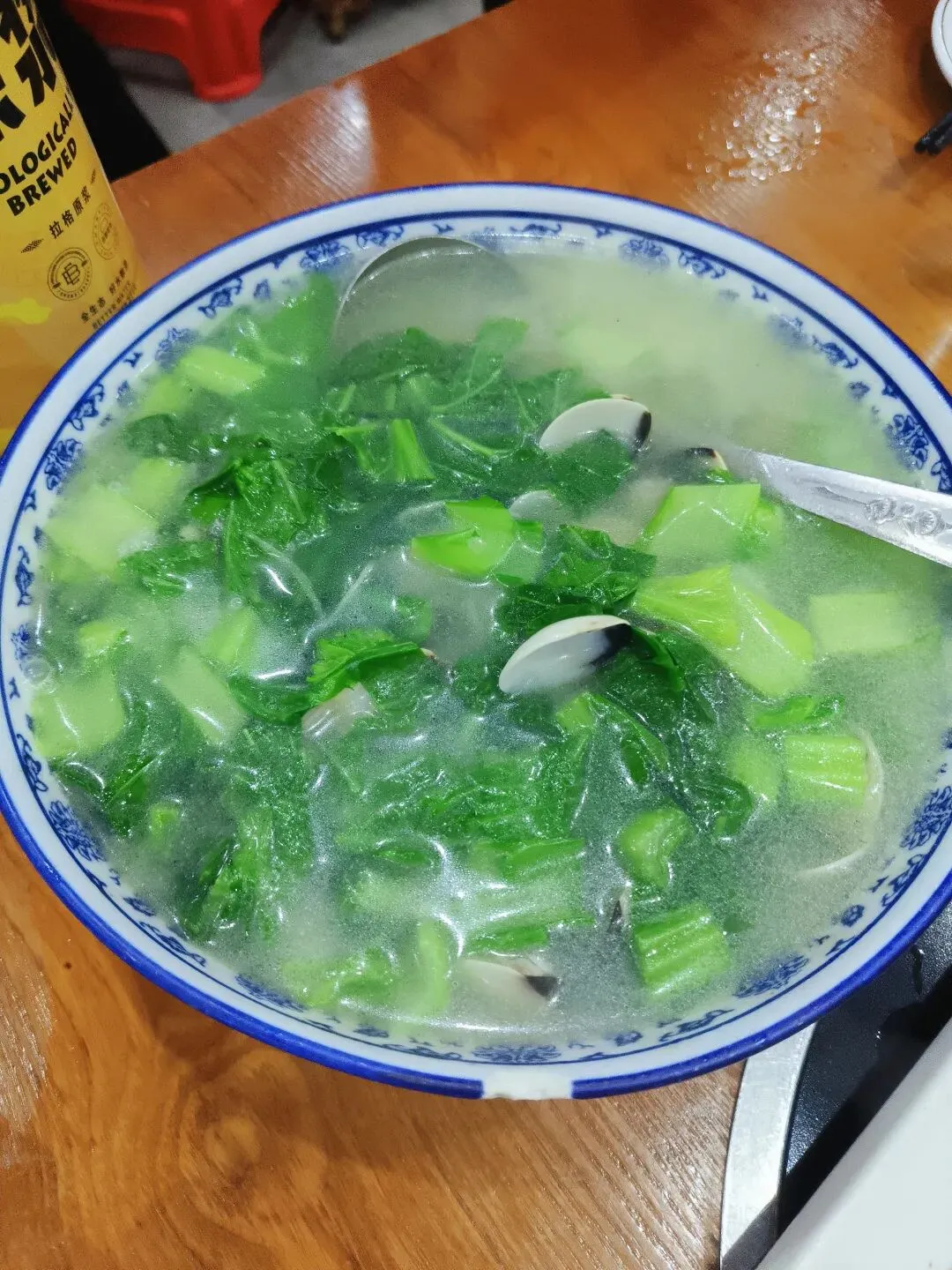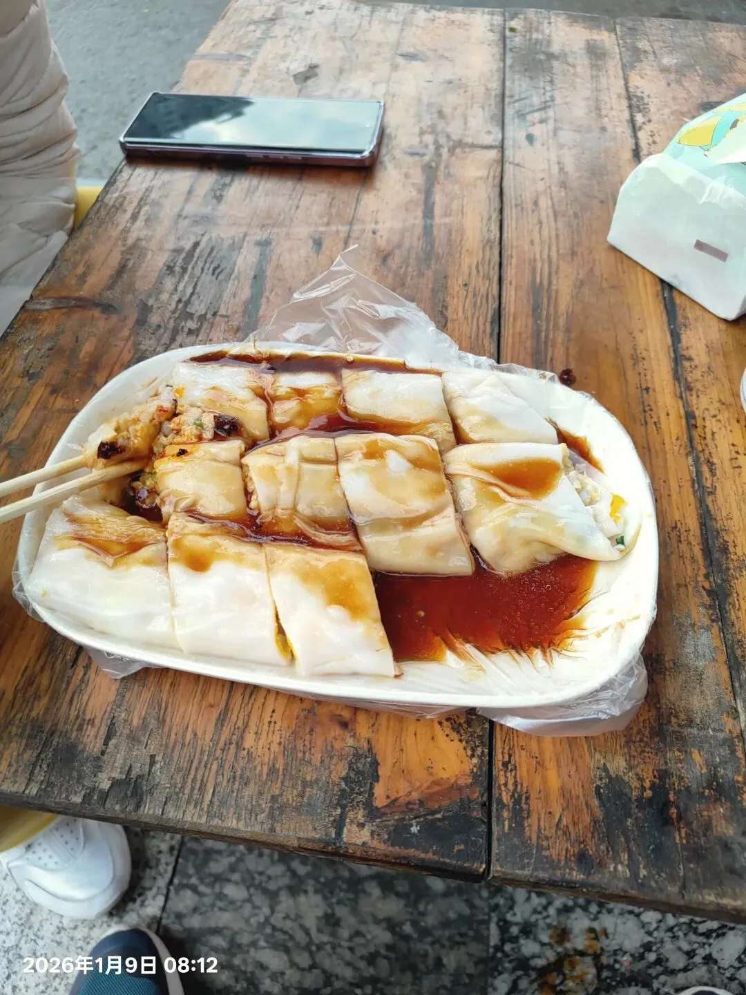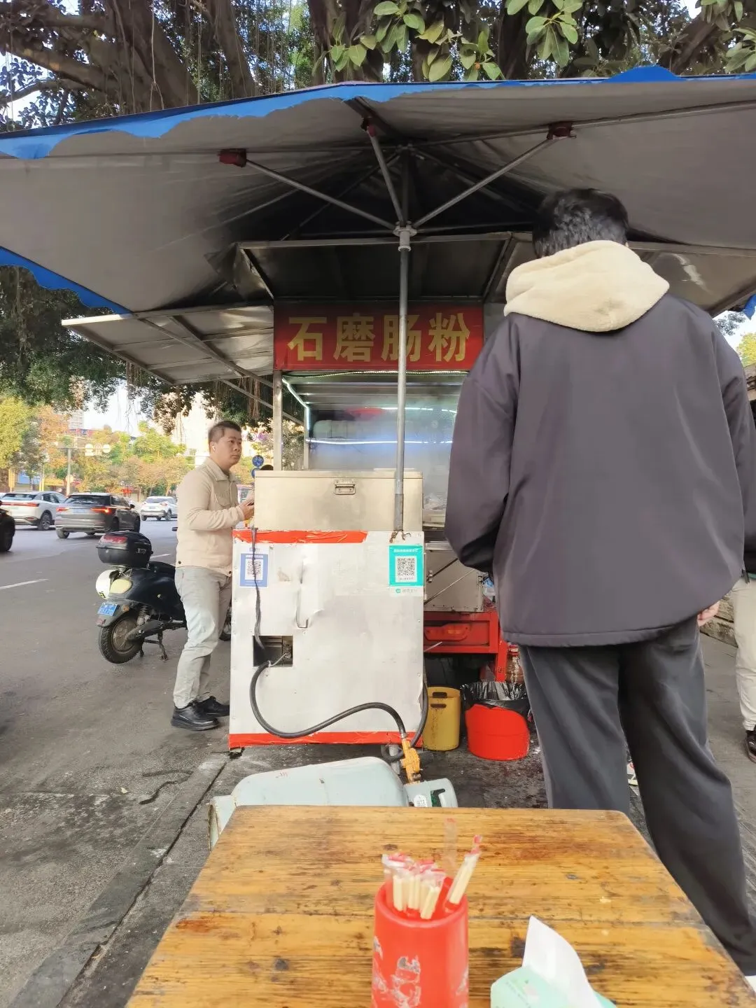 坐了一夜的动卧,一下火车又游玩了青秀山、“三街两巷”两大景区,着实有些累了,当晚我们取消了夜游邕江的安排,在宾馆附近一处农家饭庄用的晚餐。小店名叫竹园山泉美食城,看得出平时以接待旅游团餐为主,大厅有二十几张桌子,由于现在是淡季,散客更不多。我们品尝了金蚝鸡、柠檬鸭、蒸排骨等特色美食,没敢再体验老友粉的酸爽,点了一盘炒河粉。最令人味感深刻的还是一道车螺芥菜汤,车螺鲜美、时蔬清甜,很对大家胃口。另外值得庆幸一提的是,金蚝鸡里八只肥嫩的生蚝,同行的小伙伴都不喜此味,都让我收入腹中,快哉!休息了一宿,第二天一早满电复活,早早出来领略一下南宁的市井风情。相比较阳江、北海这样的慢节奏都市,南宁作为省会城市,反倒充满了略带紧张生活的烟火气息。作为南方老百姓的主要代步工具的电动车,我在杭州、成都等大城市都见识过它的规模效应,我把它称之为蝗虫,红灯停、绿灯行,乌乌泱泱、呼啸而过。南宁则有过之而无不及,一大早七点多钟,大街上就缕缕行行的跑满了电动车。上班的、讨生活的、送孩子上学的,大都骑电动车出行。骑电车的不一定是穷人,很多人都是家有轿车,也会有两三台电动车,根据出行需要选择,多数情况下开电车比开轿车方便快捷省油实惠。我们在往来穿梭的电动车背衬下,漫无目的溜达前行。街边高大的榕树亭亭如盖,不知名的绿植簇簇,过街天桥上爬满了鲜艳的三角梅,还未完全明媚的晨光映衬下,南宁略显灰调还有些老旧,但却给人一种接地气的亲切真实。路边断续的早餐摊点这么早就营业了,很多电车路过停下来,买一份或就地吃了或打包带走,就解决了早饭。一家卖石磨肠粉的摊车烟气升腾,吃客排号,我们也凑个热闹,既能品尝两广名小吃,又能感受下南宁街头的烟火生活气息。点了一个七元的蛋肉粉,街边小吃真是不贵。只见摊主熟练地把米浆均匀地浇在一块块铁板上,然后塞进蒸箱。又把凝固成熟的取出来,加上肉馅、鸡蛋或者玉米粒等各种风味辅料,熟练地卷起,切成三段并在一起,再横切成菱形块装入盘中,浇上秘制酱油就大功告成。品尝了一下,称得上味美价廉。之后在北海、广州、阳江早餐茶楼也吃过各色肠粉,回味起来,还是觉得这南宁街头的石磨肠粉最是本色本味!走回酒店往南不到200米,就是邕江支流竹排江。江畔林木繁茂,高大的树上开着红色、紫色或粉色的花朵,大概是木棉或者朱槿一类,叫不出名字。江水碧绿深邃,平缓流深,波光不惊。江边小径蜿蜒幽深,行人寥寥,探路而行良久,无法知晓尽头是何所在,终因今日上午车程已定,只得悻悻而返。人生一半是遗憾,就像这独具民族特色的美丽南宁,又怎么可能一见而窥全貌?终留一份念想给明知不会再来的未来吧。