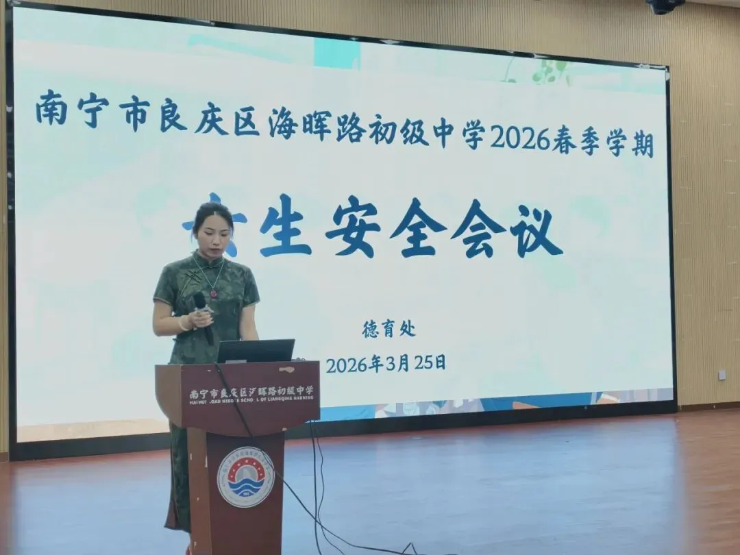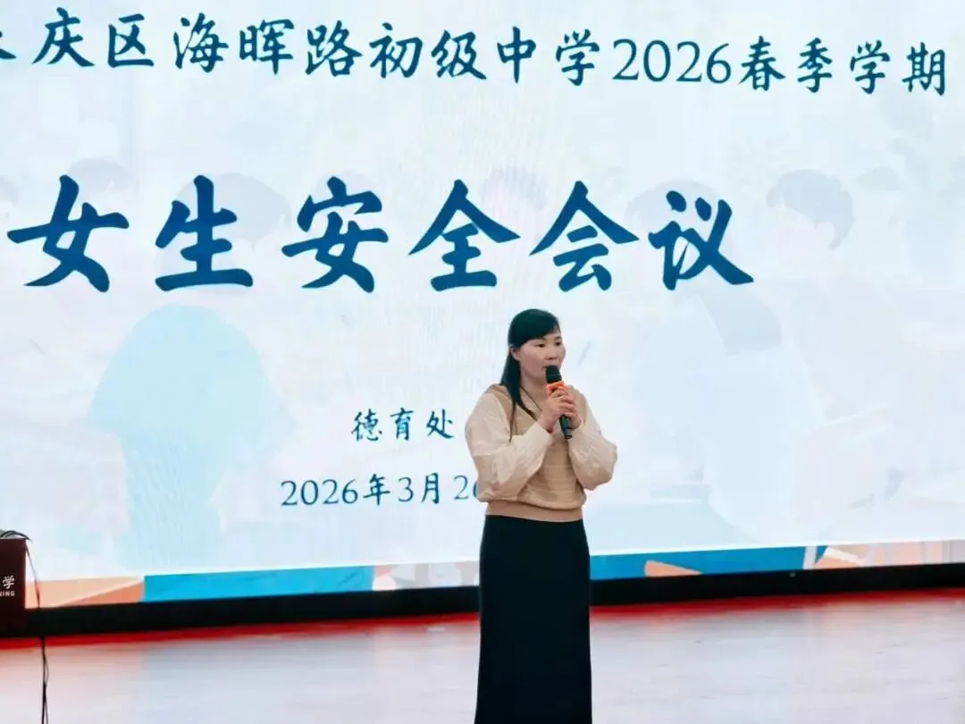 春风和煦,芳华正好。为悉心呵护花季少女身心健康成长,筑牢校园安全防护屏障,南宁市良庆区海晖路初级中学分两批于2026年3月25日和26日晚举办了“青春自护守底线,健康成长向未来 ”初中女生心理健康、防性侵害、防校园欺凌安全教育宣传活动。本次活动由学校德育处副主任陈秀元组织开展,德育干事王怡方老师担任主持工作,为全校初中女生带来一次兼具专业性、实用性与温度感的成长守护活动,为懵懂青春保驾护航。