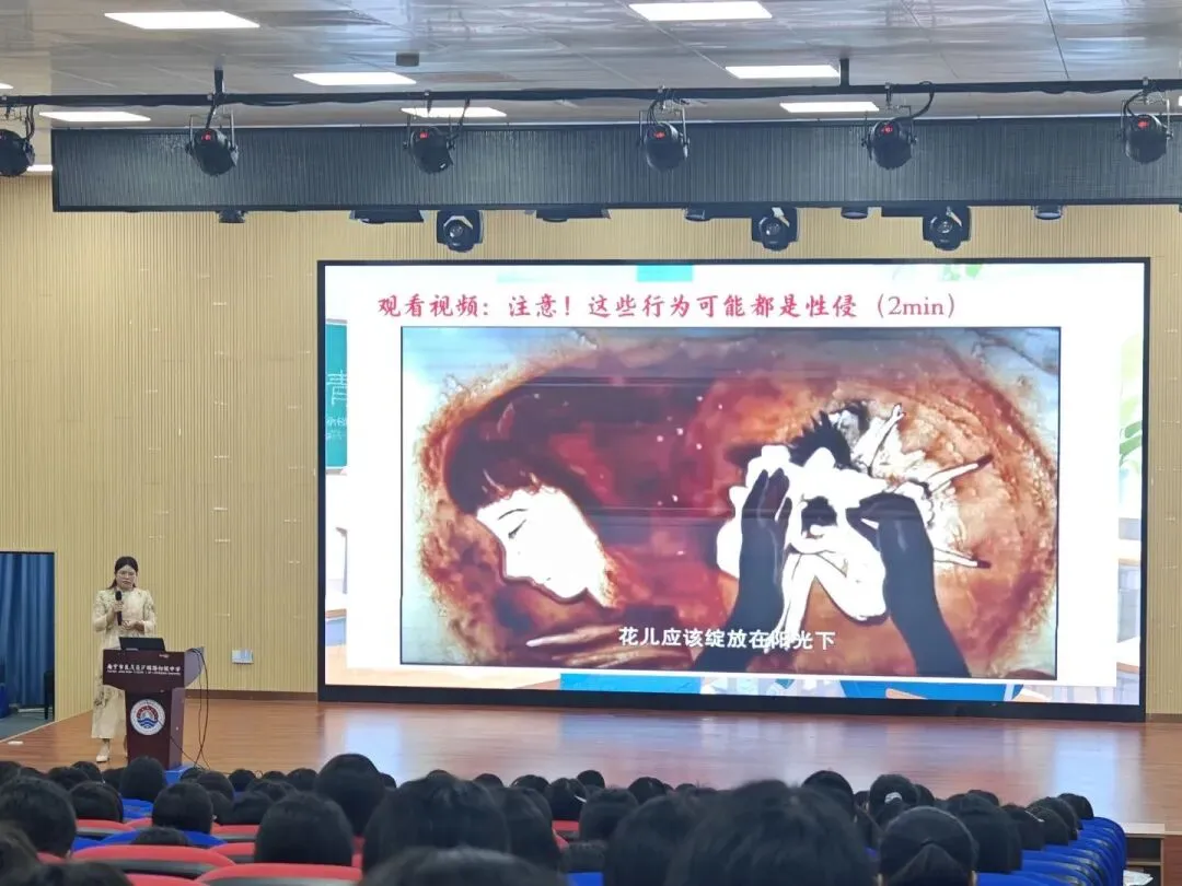 本次活动宣讲环节,学校特意邀请了拥有丰富教学经验的心理健康教师黄慧星、王艳花,分场次开展《青春自护有底线,健康成长向未来》专题讲座。两位老师结合贴近生活的真实案例,围绕异性交往边界、身体隐私区域划分、性侵害识别与应急处置等内容展开细致讲解,明确“公开集体、不单独独处”等异性交往四条准则,清晰划分身体“红黄绿”三大区域,教会同学们分清亲密相处与恶意冒犯的界限。同时拆解事前预防、事中应对、事后求助的全流程防护技巧,讲解STOP应对原则,鼓励大家鼓起勇气,敢于对不当行为说“不”,掌握实用、可落地的自我保护技能。