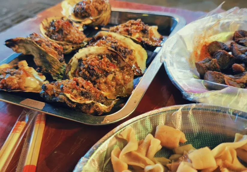 中午往海味上靠,钦州大蚝、白切海鸭、蚝仔煎都稳。大蚝不是那种靠调料压过去的鲜,而是壳一开,海的甜味直接出来,肉厚,边缘还带一点弹。晚饭可以去夜市或排档,吃炒螺、蟹粥、酸嘢。油锅滋啦响,塑料椅一坐,风带点咸,人就不想赶路了。