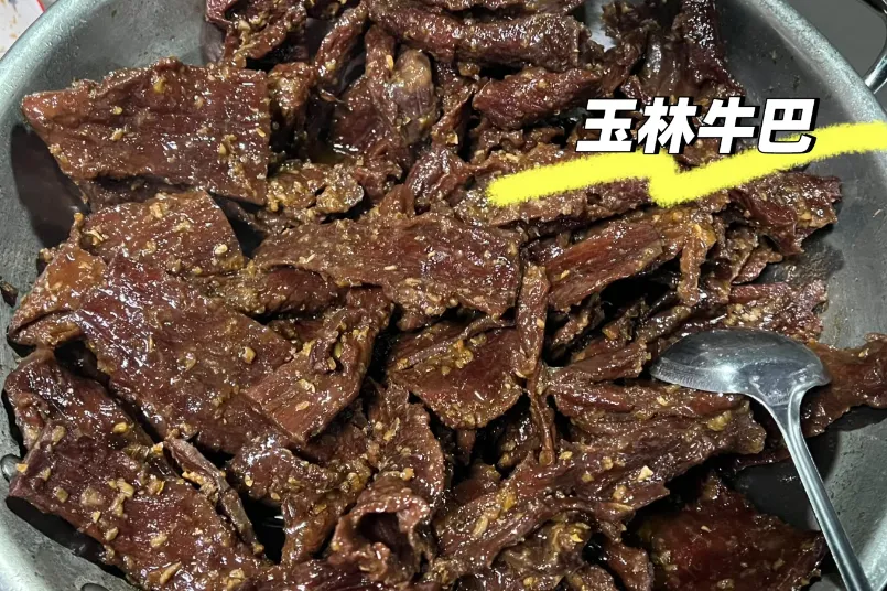 要说一道最有记忆点的,我会选牛巴。做法不复杂,但很见耐心。牛肉顺纹切片,先卤,再炒,火不能猛,酱香、糖色和香料一点点吃进去,最后收得微干。成品不靠油亮取胜,越嚼越香,适合配粉,也适合当路上零嘴。