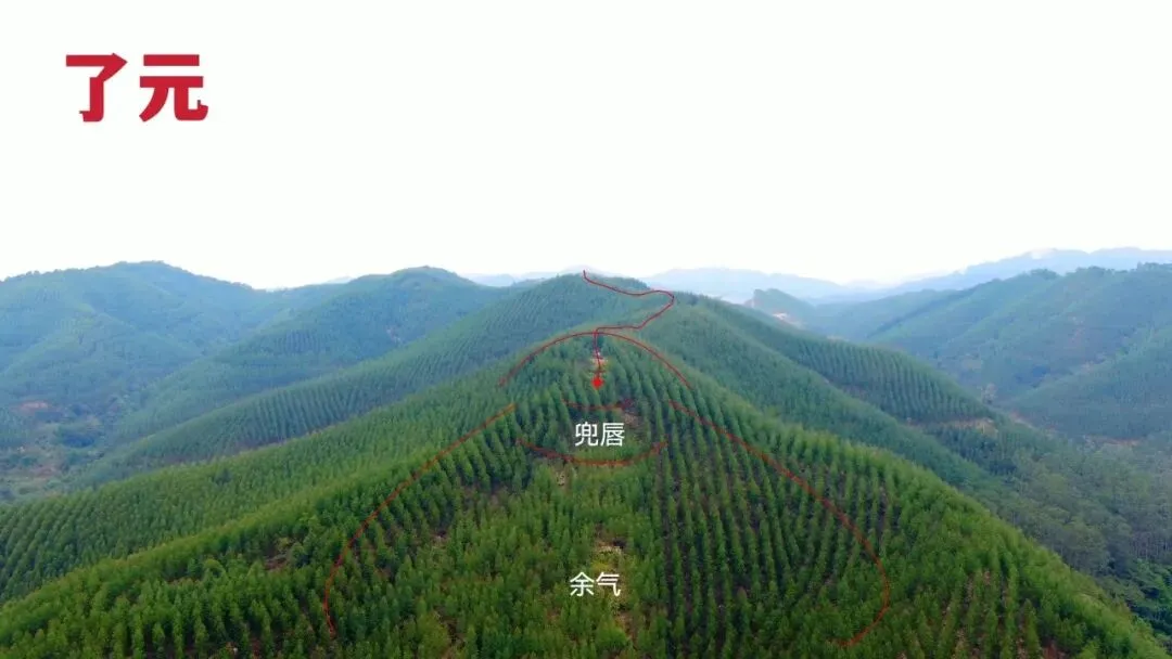03.无人机于一百多米外正看穴星,红点处即是穴场,现场看开两层唇托,穴下余气充足,穴后又起星脑,且左右开腮,微开钳口,已具备结穴的基本条件。主脉左右开帐砂脚对称抱形展开,成星行渡,龙脉自带贵气也。