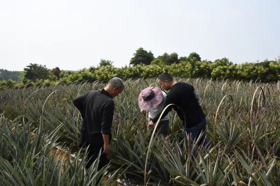 2026年3月30日,广西特色水果产业创新团队菠萝南宁综合试验站成员邓彪、刘业强等一行三人,赴南宁市江南区广西绿园农庄农业科技有限公司四季那廊生态园,开展菠萝产期调节技术指导工作。