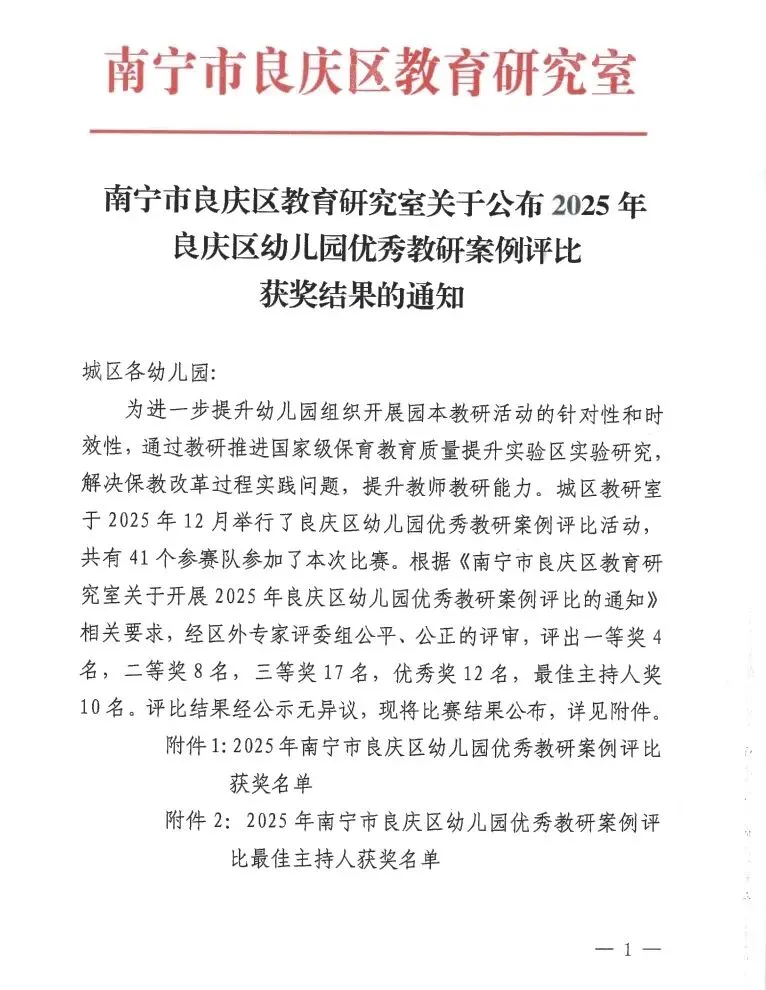 为进一步提升我园教师的专业能力,解决保教改革过程实践问题。我园积极参与南宁市良庆区教育研究室开展的2025年良庆区幼儿园优秀教研案例评比活动。