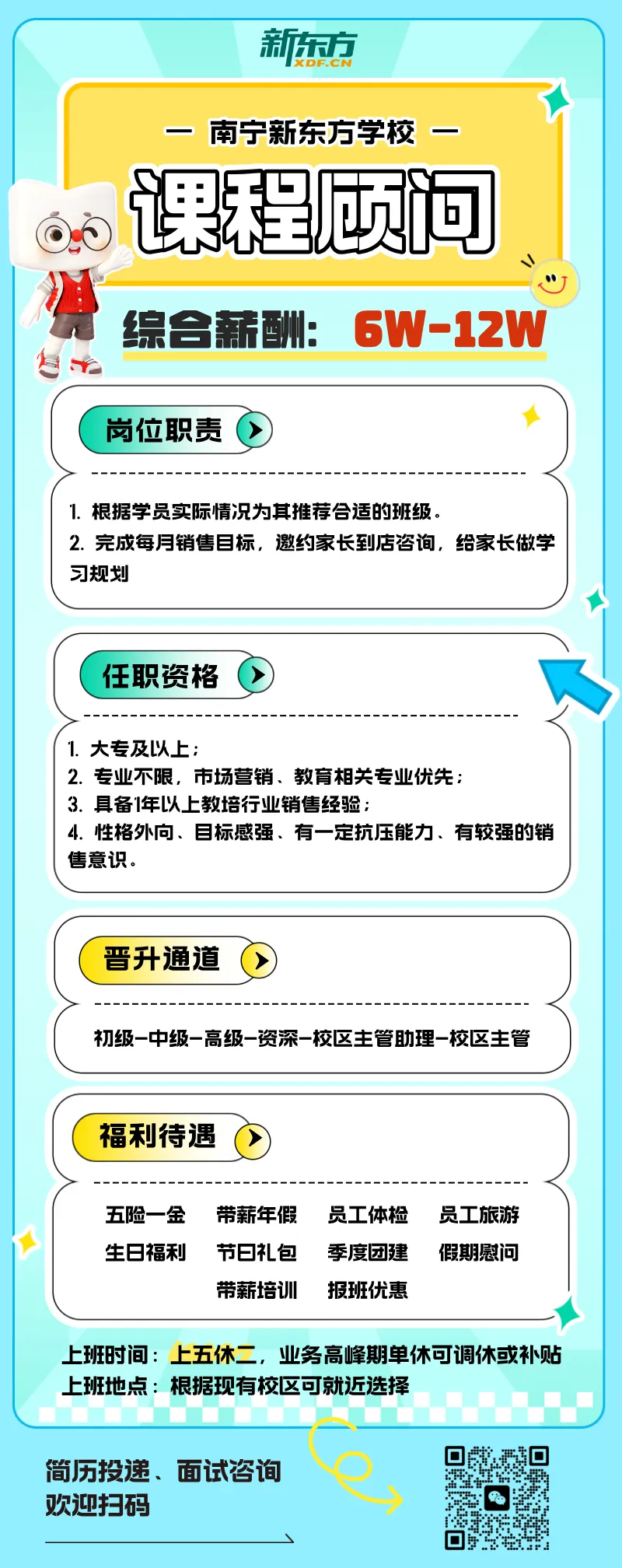 南宁新东方课程顾问热招中| 五险一金 带薪年假 年度旅游 福利好 晋升快