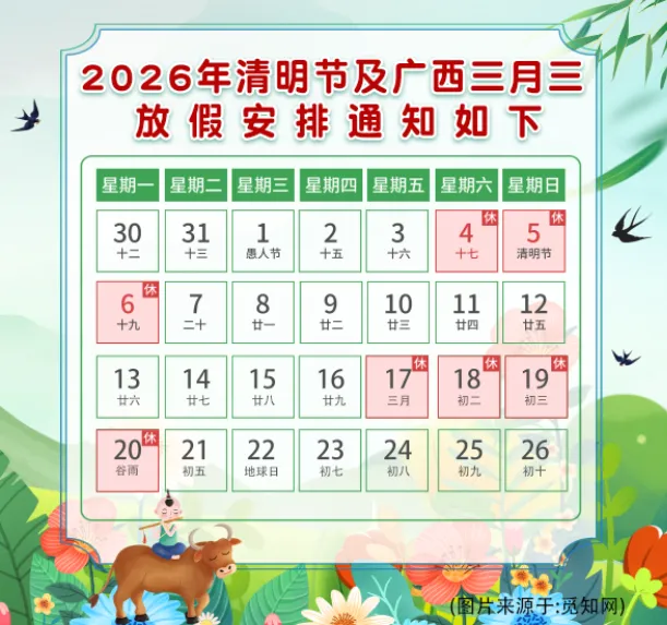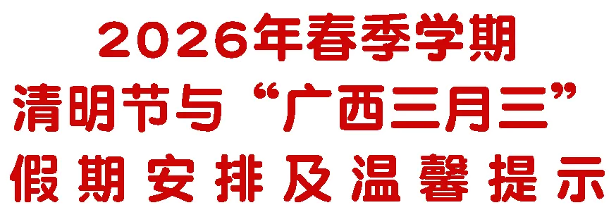 一朝春雨过,万物皆清明。在这风轻日暖的四月,我们即将迎来清明节与“广西三月三”这两个重要的传统节日。为确保孩子们度过一个安全、健康且富有意义的假期,依据上级相关通知精神,结合本园实际情况,现将假期安排及相关注意事项告知您。恳请您仔细阅读并积极配合,共同为孩子们的健康成长保驾护航。
