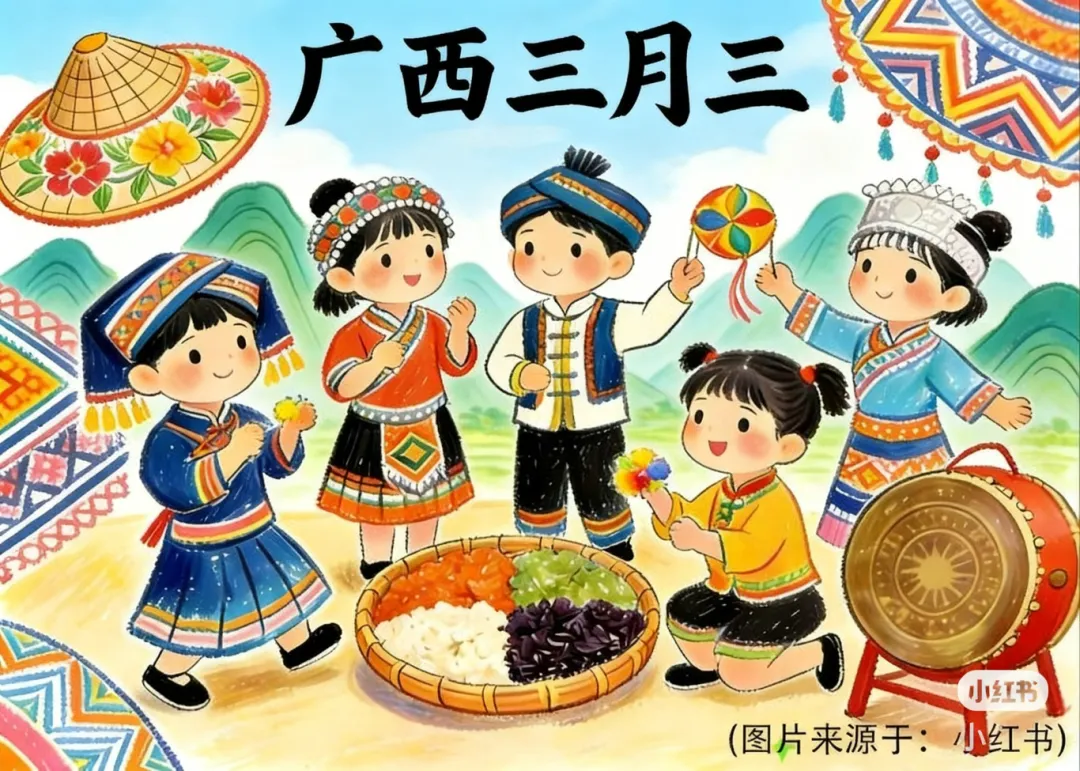 接踵而至的“农历三月三”是我国多个民族的传统节日,承载着丰富的民俗文化。家长朋友们可以引导孩子了解“广西三月三”的历史起源、传统习俗与文化内涵,积极参与或观看对歌、抛绣球、制作五色糯米饭等民俗活动,让孩子在体验中感受民族文化的魅力,增强民族认同感与文化自信。