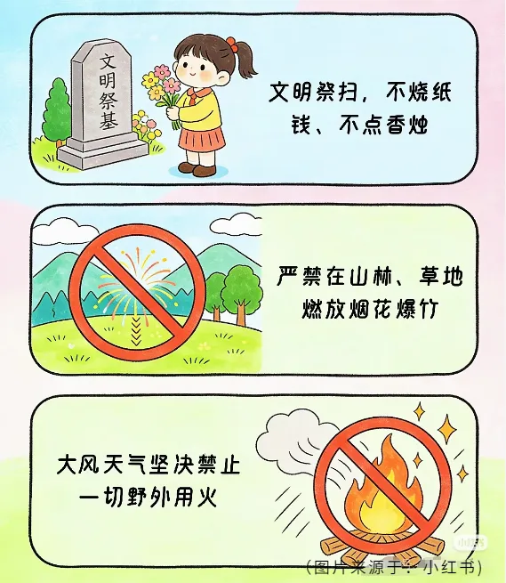 清明节祭扫时,倡导采用敬献鲜花、植树绿化、网络祭扫等文明低碳方式。带孩子外出游玩、进山徒步时,务必遵守森林防火规定,严防森林火灾。居家期间,关注细节,杜绝火灾隐患,妥善保管打火机、火柴等火源,教育孩子不玩火、不随意触碰电源插座,防止引发危险。