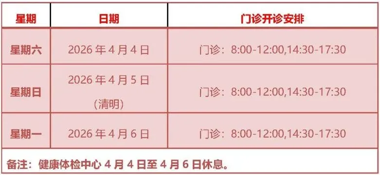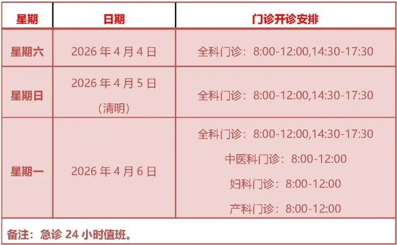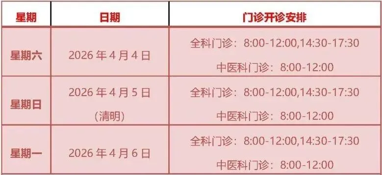 根据上级文件精神,结合我院实际情况,2026年清明节放假期间,医院门急诊工作安排如下: