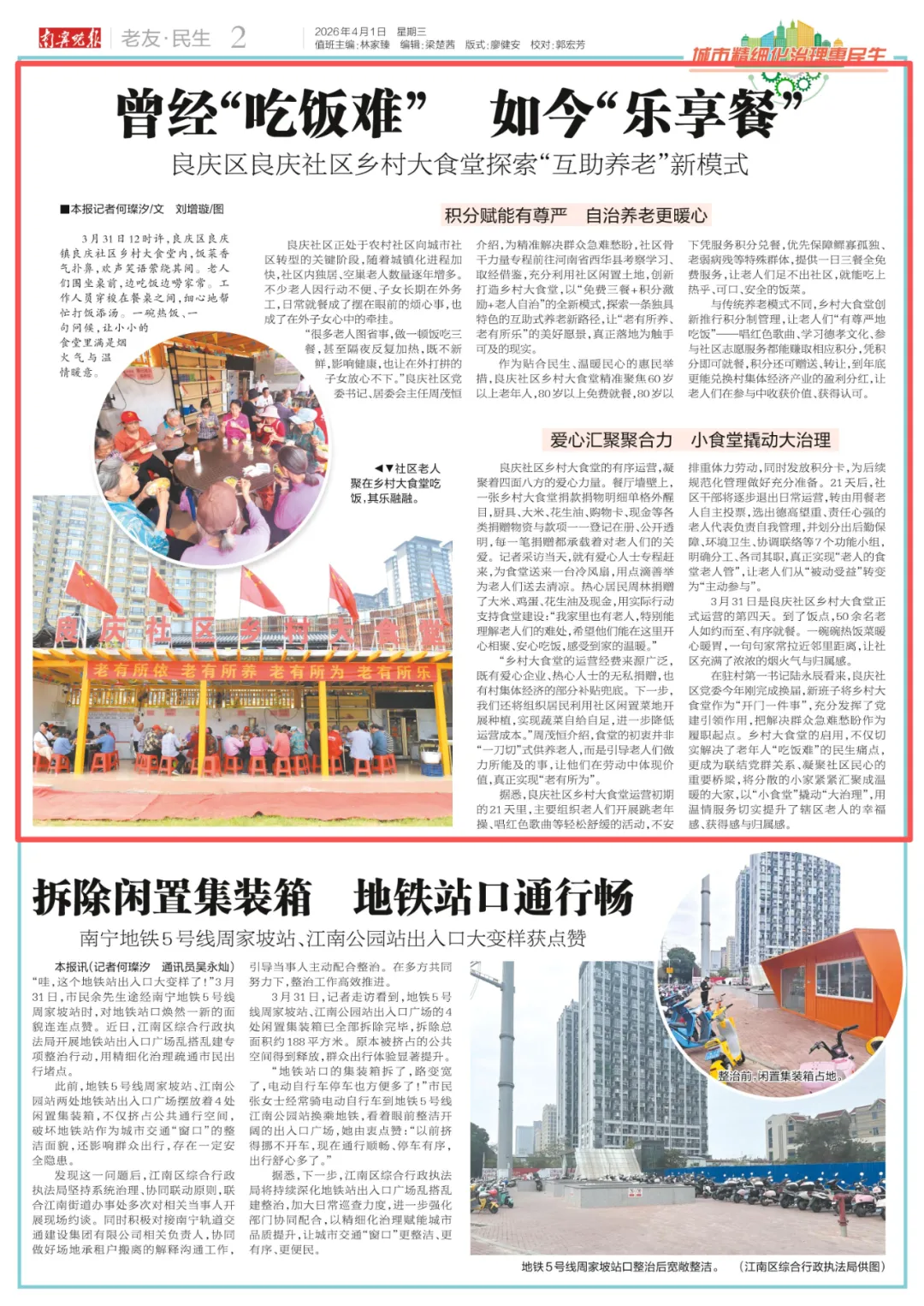 “很多老人图省事,做一顿饭吃三餐,甚至隔夜反复加热,既不新鲜,影响健康,也让在外打拼的子女放心不下。”良庆社区党委书记、居委会主任周茂恒介绍,为精准解决群众急难愁盼,社区骨干力量专程前往河南省西华县考察学习、取经借鉴,充分利用社区闲置土地,创新打造乡村大食堂,以“免费三餐+积分激励+老人自治”的全新模式,探索一条独具特色的互助式养老新路径,让“老有所养、老有所乐”的美好愿景,真正落地为触手可及的现实。
