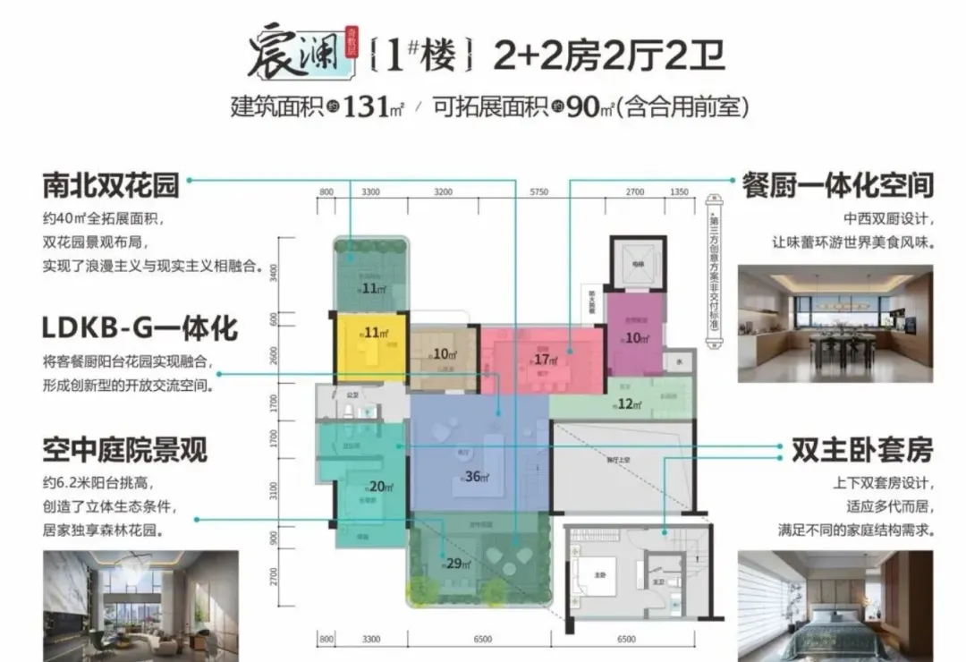 恒力书香锦宸建面约131㎡户型,可拓展面积高达90㎡,实得220㎡,配备40㎡南北双花园,6.2米挑高客厅、双主卧套房,进一步提升改善居住的舒适度。