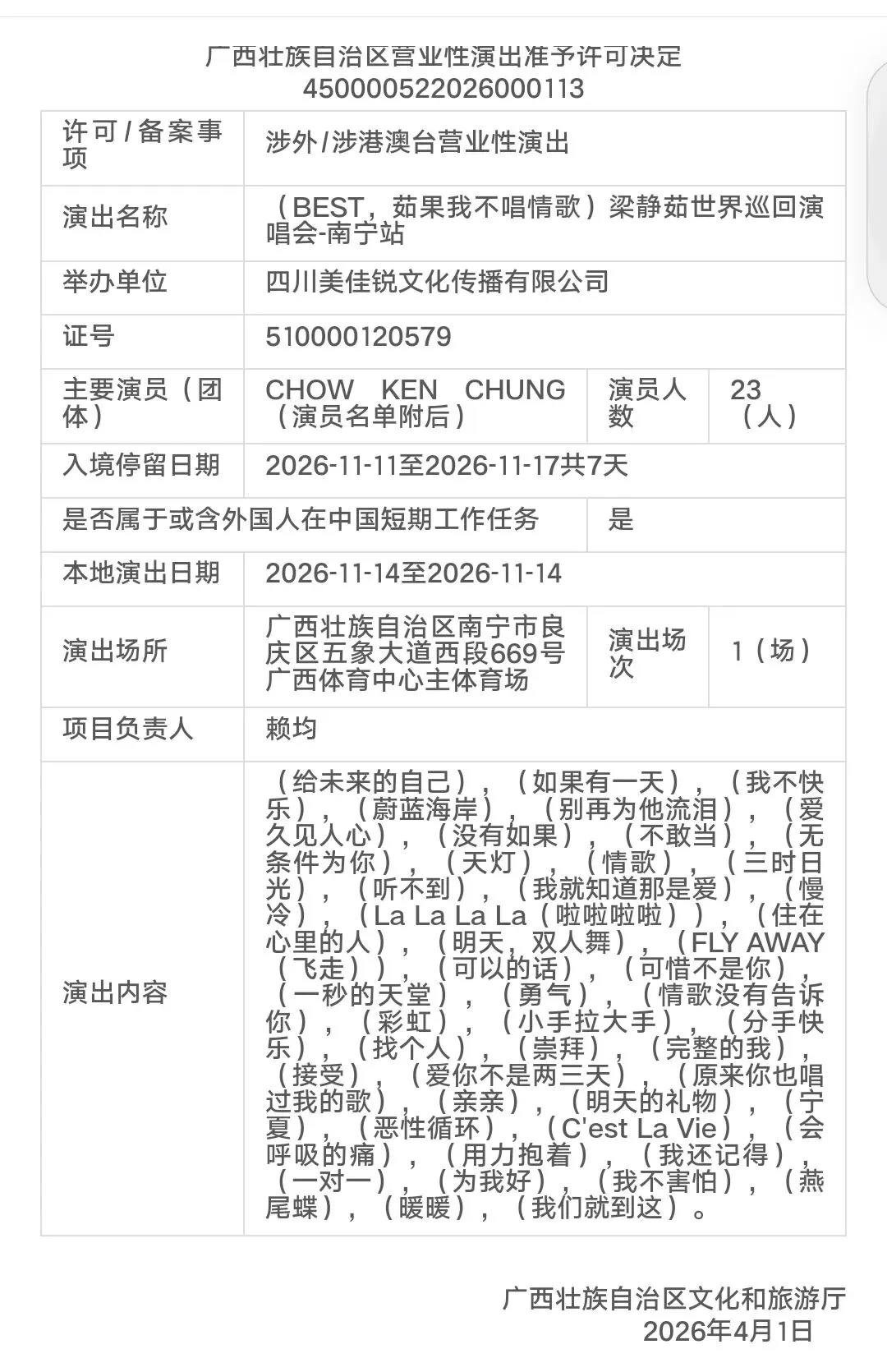 承载着无数南宁歌迷期待的梁静茹 “Best,茹果我不唱情歌” 世界巡回演唱会南宁站,今天(4 月 1 日)已正式通过广西壮族自治区文化和旅游厅审批。