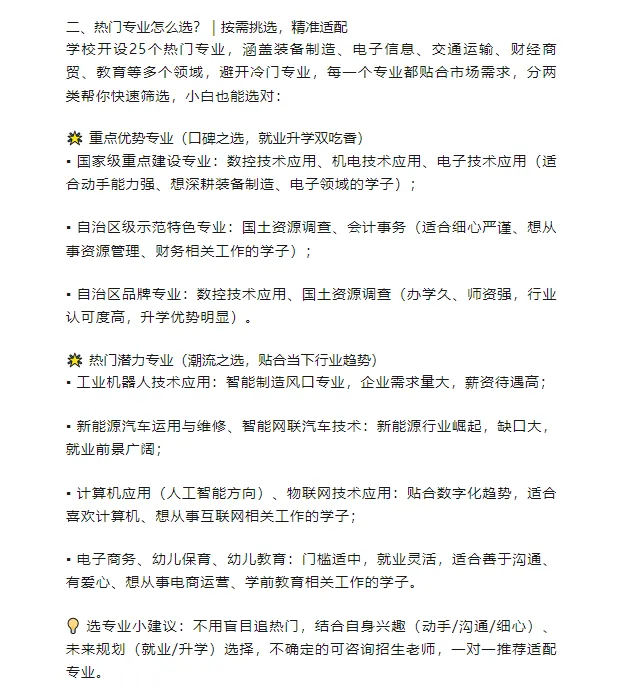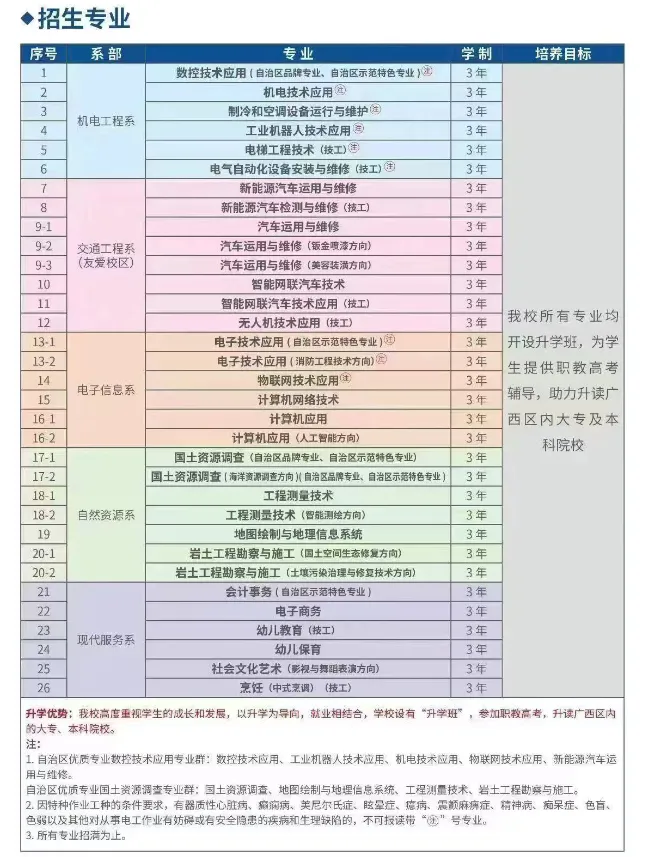 - 特色:广西唯一一所纺织服装类公办中职,服装设计、模特礼仪是王牌专业。近年来新能源汽车、工业机器人等工科专业也发展很快。
