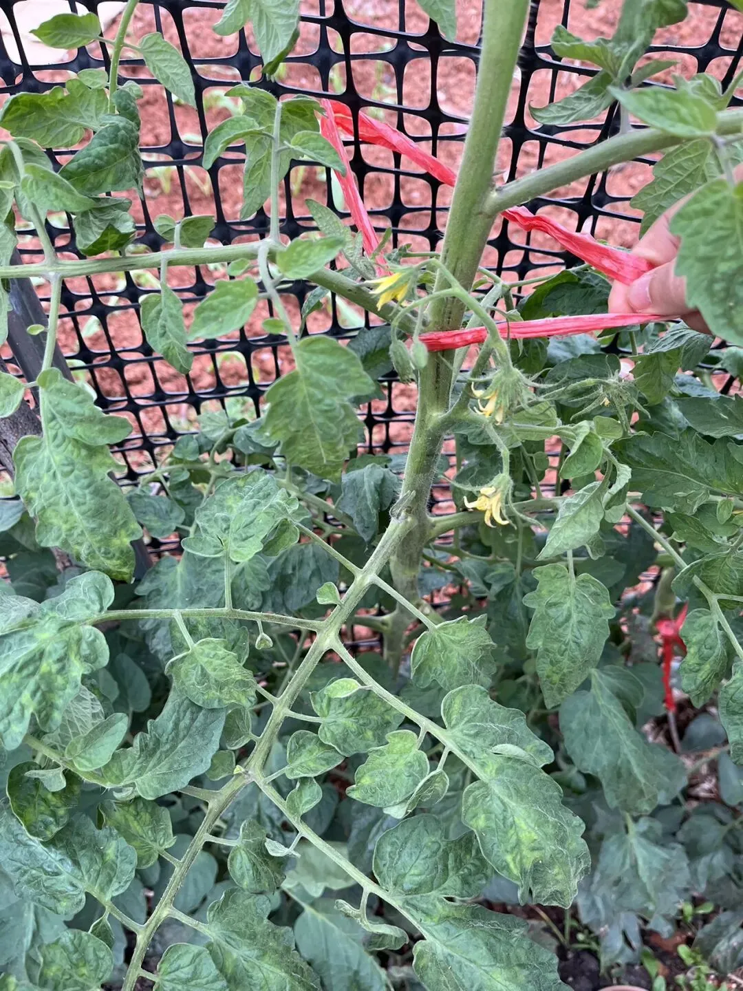 降雨后,番茄植株容易倒伏,不仅影响通风透光,还容易诱发病害,降低坐果率。我将番茄主蔓重新绑在支架上固定,清理底部多余侧枝,让养分集中供给主蔓,降低田间湿度,减少病害发生。在南宁雨季种植番茄,绑蔓整枝是必须做好的日常管理。二、香瓜上架引蔓,为高产打基础香瓜进入快速生长期,已长出卷须,我及时上架牵引,让藤蔓顺着支架向上生长。上架后光照更充足、通风更好,后期瓜型更端正,病害也更少。家庭小菜园简单搭架,就能明显提升产量和品质。三、空心菜、韭菜:追施腐熟鸡粪+浇水,促复壮