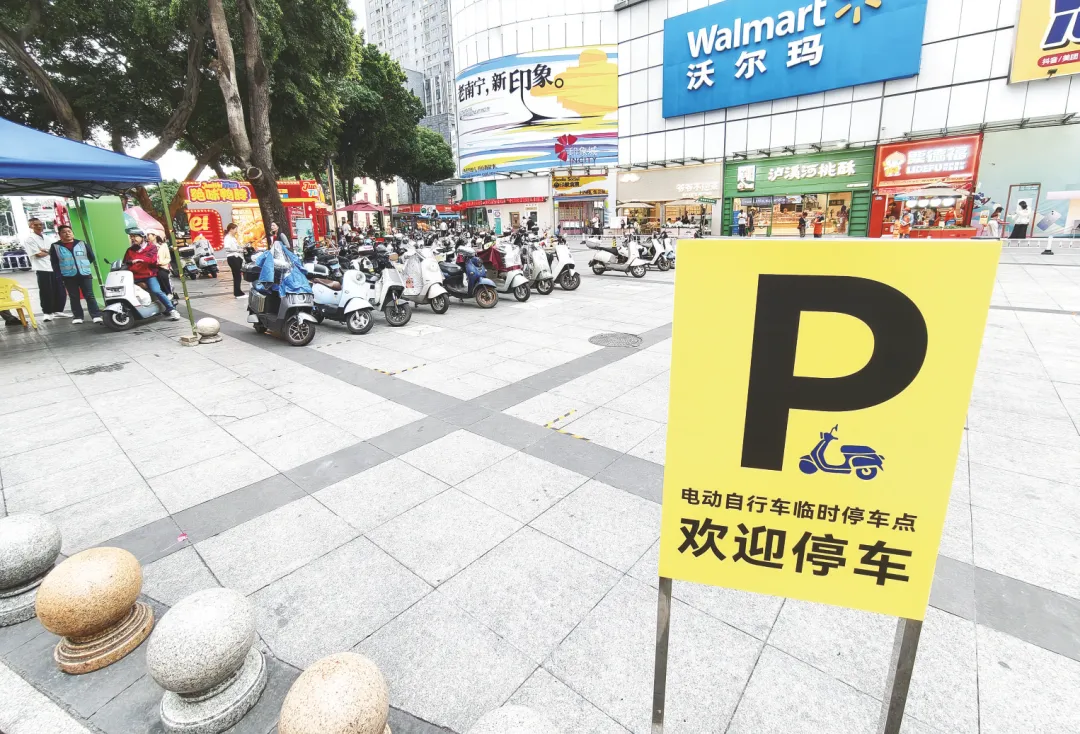 在商圈绕圈找车位,是市民骑电动自行车出行时遇到的烦心事。近期,南宁交警联合多部门开展朝阳商圈、吾悦广场周边停车秩序专项整治,通过“一点一策”系统推进电动自行车泊位扩容,目前朝阳商圈已增泊位450余个。