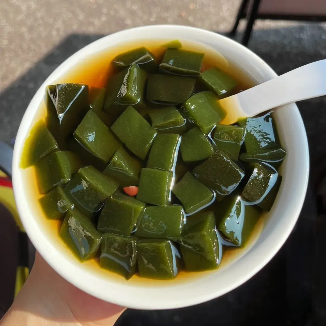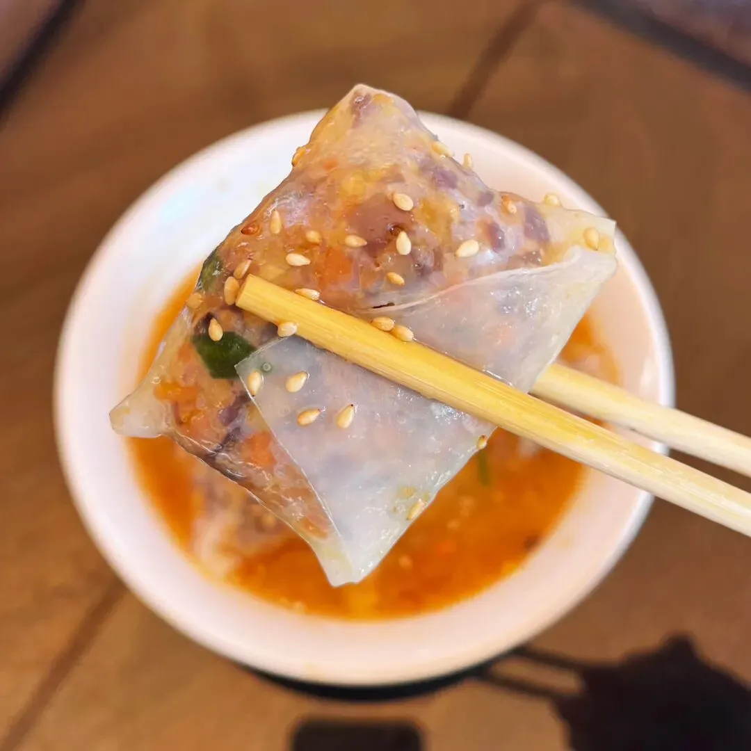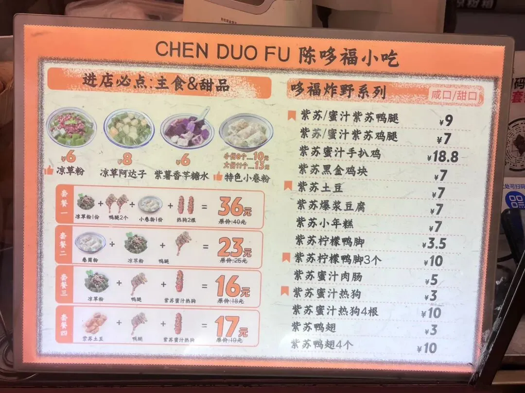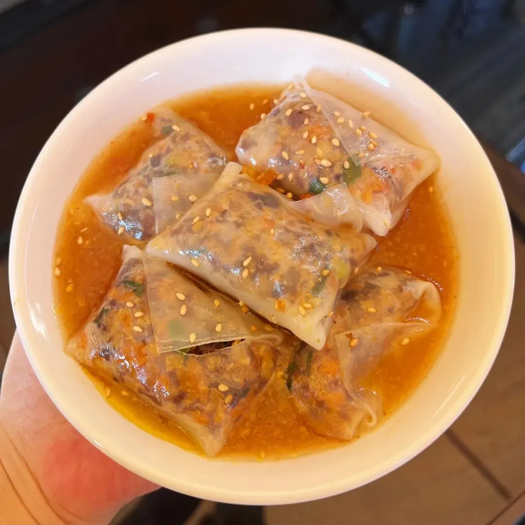 在广西,卷筒粉是很常见的一种米粉的吃法,卷筒粉结合了肠粉跟春卷,但是又和肠粉跟春卷有所不同,在不同的地方,馅料的口味还有米粉皮的薄厚也有所不同。南宁的卷筒粉店数不胜数,大多都是卷成长筒形状,平常吃卷筒粉的时候,直接咬断或是用筷子夹断,多少有些不太方便。终于有一家小吃店,解决了这种麻烦。这家卷筒粉,用薄薄的米粉皮将馅料卷成一个个饱满的小方块,像一个个软乎乎的“小枕头”,小巧精致可爱,嘴巴比较大的话,刚好可以一口一个。有些时候,吃卷筒粉,觉得有些卷筒粉皮太厚,加上馅料比较少的话,就会觉得那厚厚的米粉皮特别碍事,它影响到我们吃里头的馅了。而这家卷筒粉,米粉皮薄薄的,晶莹剔透,透着光,就可以看到里面塞得满满当当的馅料。别看米粉皮薄薄的,但是它软糯有韧性,吃起来也不粘牙。里面的馅料有些像粉饺的馅料,有木耳、胡萝卜、碎肉等……米粉皮也有些像粉饺的皮,不过要比粉饺的皮更薄一些。这家的这个小卷粉,吃起来口感有些像粉饺,但是和粉饺不同的是它泡在红亮酸甜的汤汁里,这个吃法很特别。平常吃粉饺的时候,总觉粉饺皮口感淡淡的不入味,而这个小卷粉直接泡在汤汁里,加上皮又薄,吃起来非常入味。这家小卷粉原本是一个朋友在仙湖那边吃到觉得很好吃,给发过来的一张图,看到下面这张图,直接就被吸引了。仙湖离自己住的地方有点远,刚好发现大沙田刚好也有一家。立刻就跑到大沙田这家试了,到了这家店,发现这家小吃店除了小卷粉,还有其他好吃的东西,那天去吃小卷粉的时候,出大太阳,天气特别热,直接被他们家绿绿的凉草粉糖水给吸引了。这凉草粉糖水上面还放了一些红豆,不过都沉到下边去了。凉草粉滑嫩Q弹,有些像吃布丁,而且吃起来很清凉,很适合在炎热的天气里吃。如果刚好点了油炸的东西,这凉草粉糖水刚好可以解腻,顺便降降火。紫苏蜜汁鸭腿看着也好好吃的样子,就顺便也点了一份。但是那天太晒太热了,有点头晕,加上拍特色小卷粉和凉草粉糖水花了太长的时间,在吃紫苏蜜汁鸭腿时,鸭腿已经冷了,吃起来口感不是很好,没吃几口,所以不好评价。见有人说紫苏鸭腿要趁热吃才好吃,或许刚炸出味道应该是不错的,有机会再试试。那天坐在那里吃,听到有一个小姑娘一直说紫苏小年糕好好吃。后悔刚开始没有点小年糕了,只能下次再试了。这家店叫“陈哆福小吃”,我去吃的这家是在大沙田志远街,紫晶城市花园1号楼那排商铺那里。