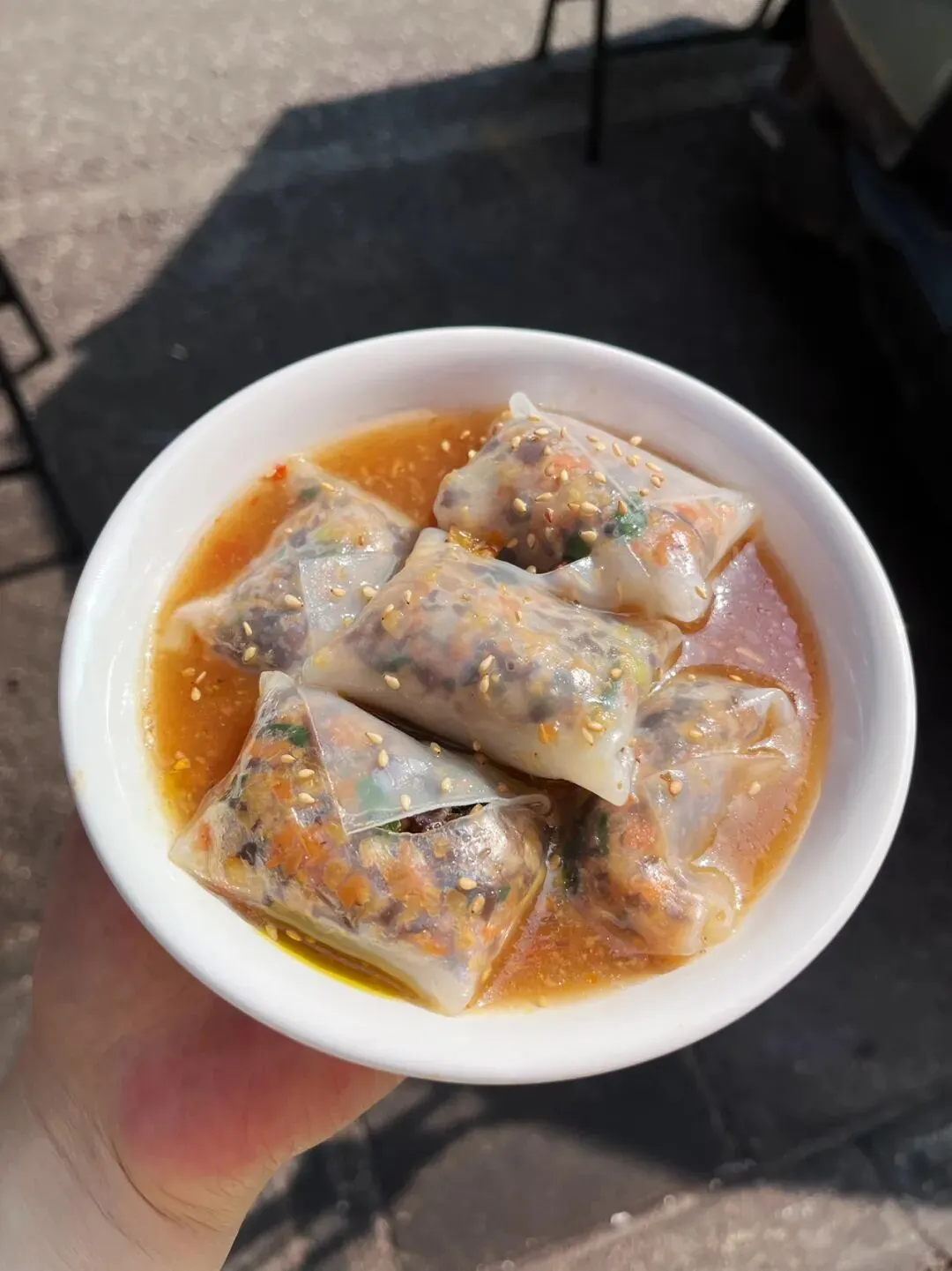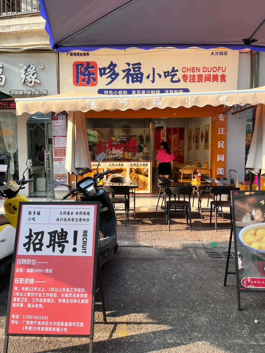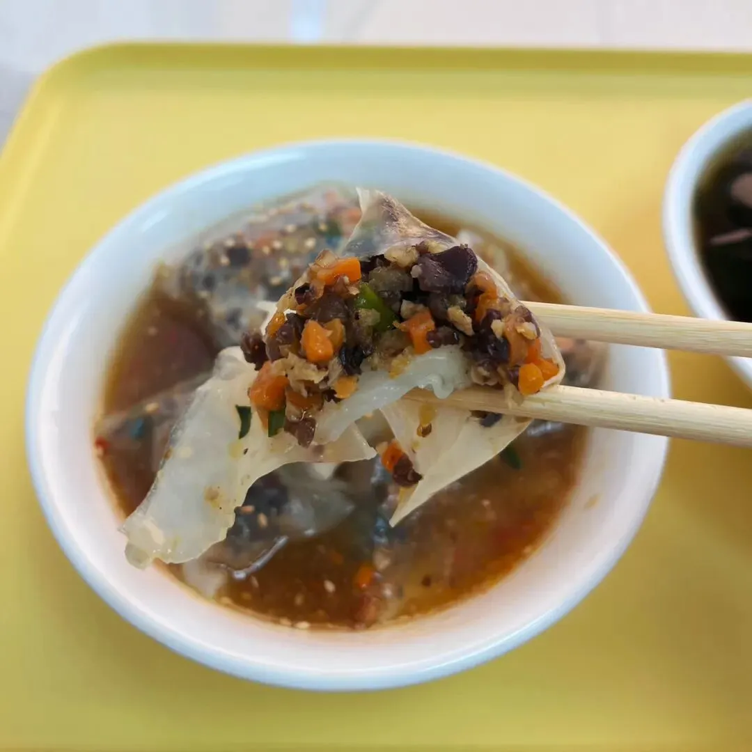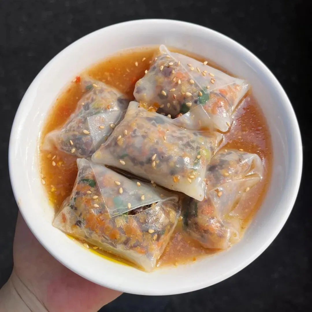在广西,卷筒粉是很常见的一种米粉的吃法,卷筒粉结合了肠粉跟春卷,但是又和肠粉跟春卷有所不同,在不同的地方,馅料的口味还有米粉皮的薄厚也有所不同。南宁的卷筒粉店数不胜数,大多都是卷成长筒形状,平常吃卷筒粉的时候,直接咬断或是用筷子夹断,多少有些不太方便。终于有一家小吃店,解决了这种麻烦。这家卷筒粉,用薄薄的米粉皮将馅料卷成一个个饱满的小方块,像一个个软乎乎的“小枕头”,小巧精致可爱,嘴巴比较大的话,刚好可以一口一个。有些时候,吃卷筒粉,觉得有些卷筒粉皮太厚,加上馅料比较少的话,就会觉得那厚厚的米粉皮特别碍事,它影响到我们吃里头的馅了。而这家卷筒粉,米粉皮薄薄的,晶莹剔透,透着光,就可以看到里面塞得满满当当的馅料。别看米粉皮薄薄的,但是它软糯有韧性,吃起来也不粘牙。里面的馅料有些像粉饺的馅料,有木耳、胡萝卜、碎肉等……米粉皮也有些像粉饺的皮,不过要比粉饺的皮更薄一些。这家的这个小卷粉,吃起来口感有些像粉饺,但是和粉饺不同的是它泡在红亮酸甜的汤汁里,这个吃法很特别。平常吃粉饺的时候,总觉粉饺皮口感淡淡的不入味,而这个小卷粉直接泡在汤汁里,加上皮又薄,吃起来非常入味。这家小卷粉原本是一个朋友在仙湖那边吃到觉得很好吃,给发过来的一张图,看到下面这张图,直接就被吸引了。仙湖离自己住的地方有点远,刚好发现大沙田刚好也有一家。立刻就跑到大沙田这家试了,到了这家店,发现这家小吃店除了小卷粉,还有其他好吃的东西,那天去吃小卷粉的时候,出大太阳,天气特别热,直接被他们家绿绿的凉草粉糖水给吸引了。这凉草粉糖水上面还放了一些红豆,不过都沉到下边去了。凉草粉滑嫩Q弹,有些像吃布丁,而且吃起来很清凉,很适合在炎热的天气里吃。如果刚好点了油炸的东西,这凉草粉糖水刚好可以解腻,顺便降降火。紫苏蜜汁鸭腿看着也好好吃的样子,就顺便也点了一份。但是那天太晒太热了,有点头晕,加上拍特色小卷粉和凉草粉糖水花了太长的时间,在吃紫苏蜜汁鸭腿时,鸭腿已经冷了,吃起来口感不是很好,没吃几口,所以不好评价。见有人说紫苏鸭腿要趁热吃才好吃,或许刚炸出味道应该是不错的,有机会再试试。那天坐在那里吃,听到有一个小姑娘一直说紫苏小年糕好好吃。后悔刚开始没有点小年糕了,只能下次再试了。这家店叫“陈哆福小吃”,我去吃的这家是在大沙田志远街,紫晶城市花园1号楼那排商铺那里。