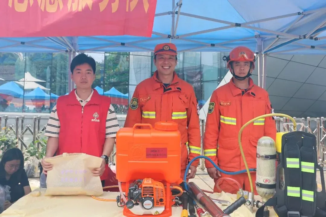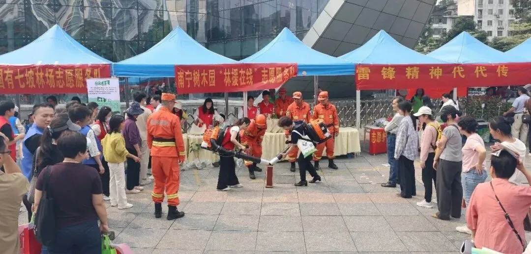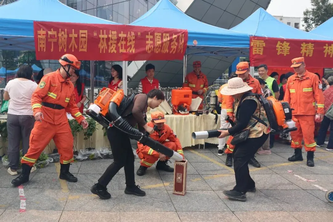活动现场,南宁树木园展位前人头攒动、氛围热烈。由南宁树木园森林消防专业队精心设计的“森林防火体验”互动项目,成为全场亮眼的“人气打卡点”。在森林消防队员的专业指导下,市民群众纷纷背起灭火器,沉浸式模拟森林火灾扑救场景。通过亲身体验,大家深切感受到森林防火工作的责任与艰辛,自觉将“生态保护,人人有责”的理念植入心底。参与互动体验的群众,还能领取南宁树木园自主组培的金花茶、黄花梨树苗以及冻干金花茶等特色纪念品。这场兼具趣味与科普的活动累计吸引近500名群众踊跃参与。