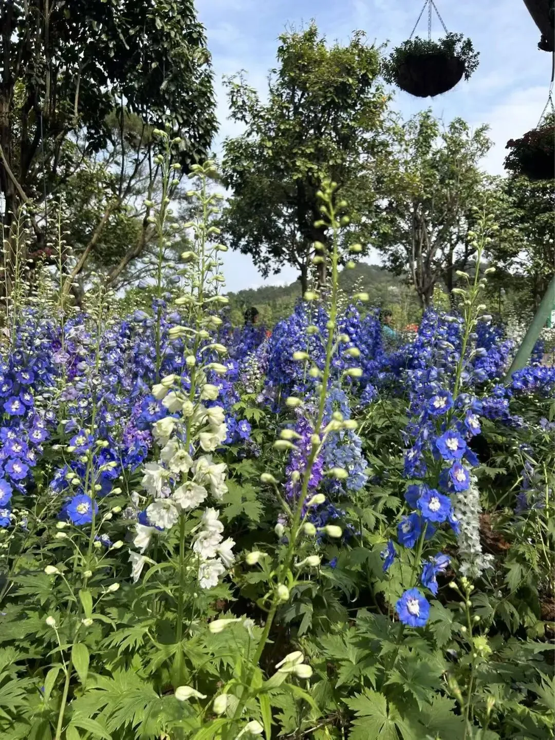 不远处的地方,飞燕草也开得正盛。蓝紫色的花穗高高挺立,像一群振翅欲飞的小燕子,在微风中轻轻摇曳。有洁白的小花点缀入其间,蓝白交织,更像一幅清新的水彩画,引得蜜蜂和蝴蝶在花丛中翩翩起舞,嗡嗡的叫声好像是在为春天歌唱。
