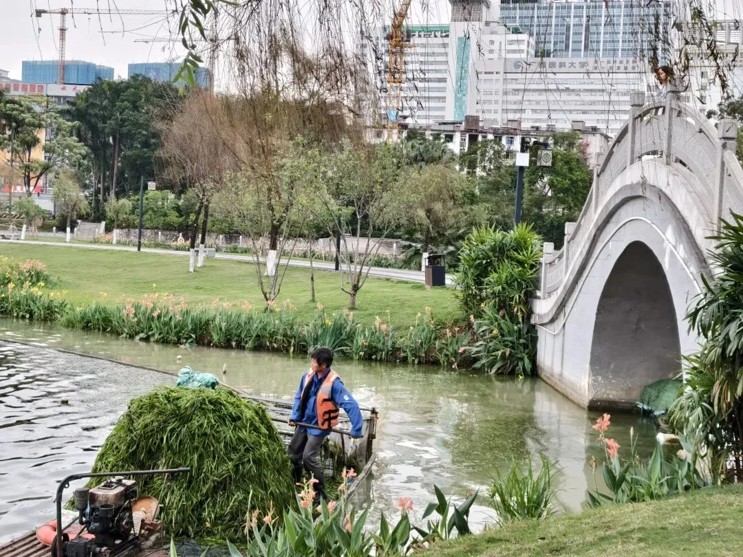 工人划着小船在捞起水面的水草。
