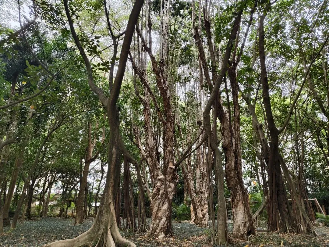 近处婆娑的树影,远处绿意盎然的小树林。