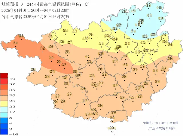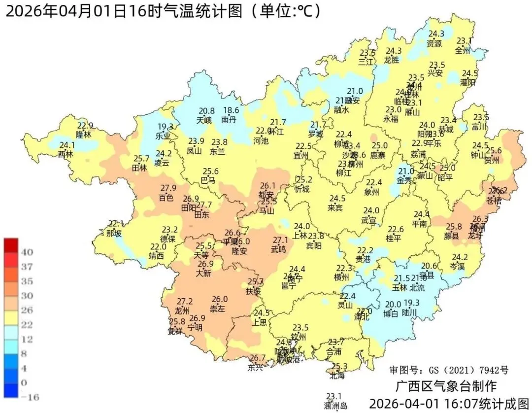 相关数据显示,3月31日上午8时至4月1日上午8时,降雨主要集中在桂北、桂东,雨量为小到中雨、局地大雨,个别地方暴雨。桂西以及桂南大部最高气温达到26~31℃、局地32~33℃。