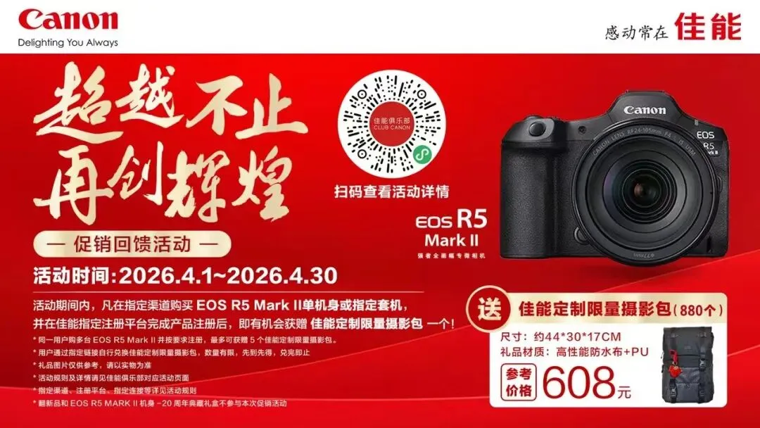 🎉 活动期间,凡购买指定款佳能EOS R5 Mark II相机单机身或指定套机,并完成产品注册,即可获得限量定制摄影背包一份!