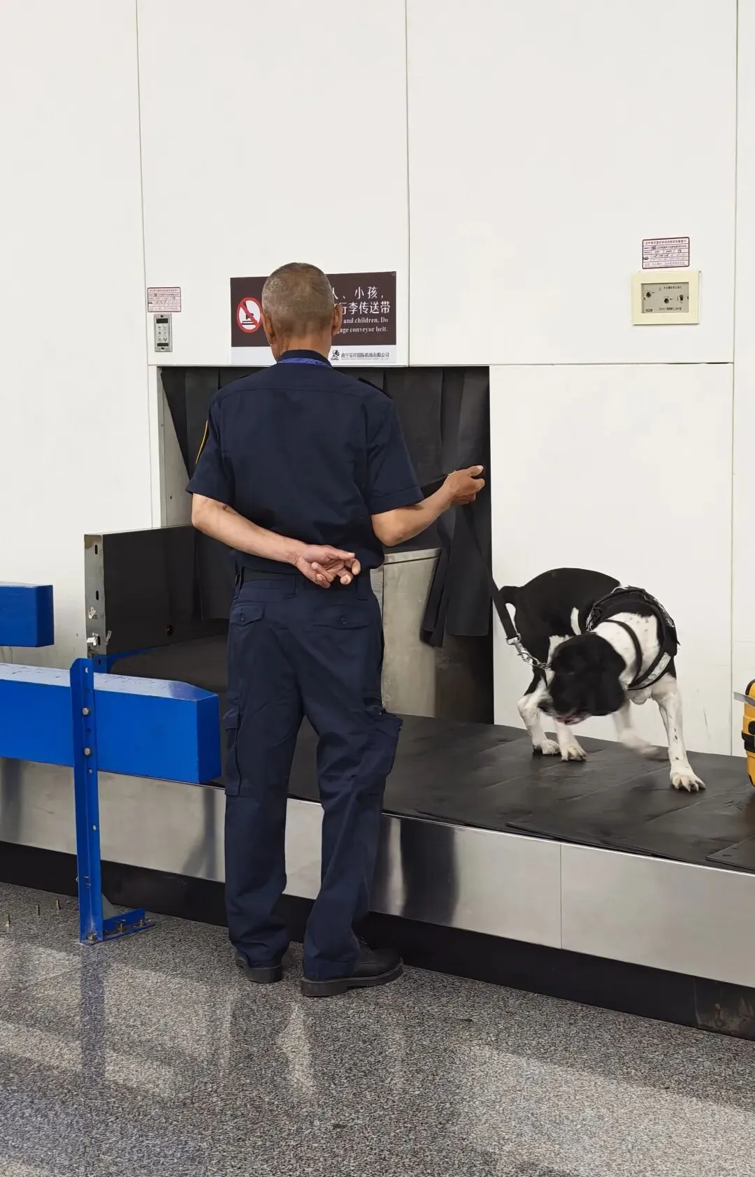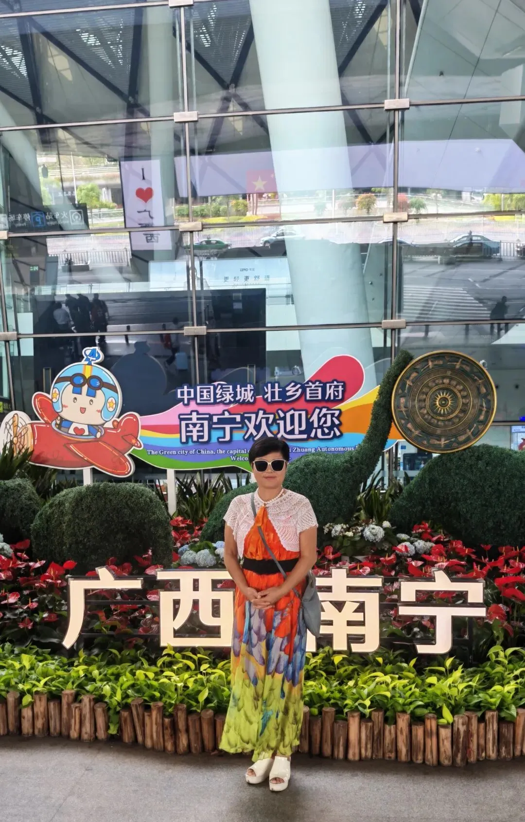 12点38分飞机降落南宁机场。南宁机场应该是军用和民用两用机场,飞机在开始降落时,飞机乘务员用中英文广播,关闭飞机玄窗遮光板,在飞机降落后才可打开。机场里冷冷清清,看不到多少乘客,我们很快拿到了托运的行李。在等候行李的传输带出口处,一名机场警察带着一只警犬在紧张的工作,警犬用鼻子检查每一件出来的行李是否有毒品,这里靠近越南,其实警犬的工作也是很辛苦的。