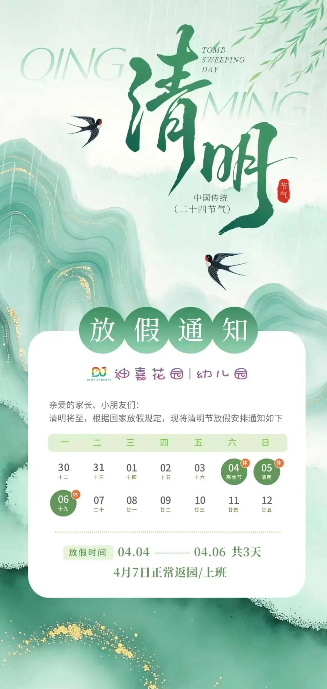 根据法定节假日结合我园实际情况,现将清明放假安排及温馨提示如下: