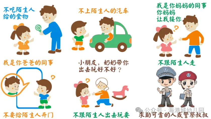 ✿教育孩子一定不要随便给陌生人开门;时刻关注孩子,教育幼儿外出时一定紧跟家长以免丢失,跟大人逛商场时不乱跑;一旦和爸爸妈妈走散,第一时间找警察,千万不能随便跟着陌生人走,不随便吃陌生人给的东西。