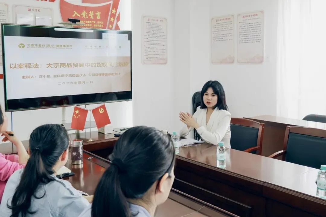 4月1日,盈科南宁高级合伙人、公司法律事务部副主任官小星律师应邀前往广西供应链服务集团有限公司,为该公司相关业务骨干及管理人员开展一场主题为“以案释法:大宗商品贸易中的货权风险防控”的专题法律培训。