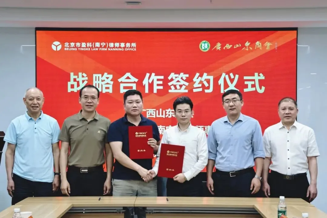 3月27日下午,在司法部、全国工商联、中华全国律师协会“万所联万会”机制指引下,北京市盈科(南宁)律师事务所(以下简称“盈科南宁”)与广西山东商会正式签署战略合作协议。广西山东商会执行会长兼秘书长苏衍荣、监事长彭辉、办公室秘书林秦秀及会员企业代表李恩传,盈科南宁党总支书记、执行主任张海涛,管委会主任、高级合伙人覃锦茂,高级合伙人、公司法律事务部主任郑中华及团队成员共同出席签约仪式。