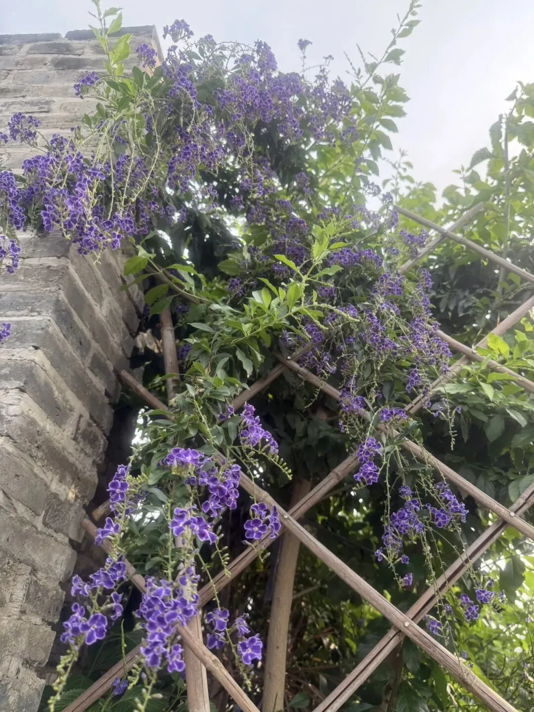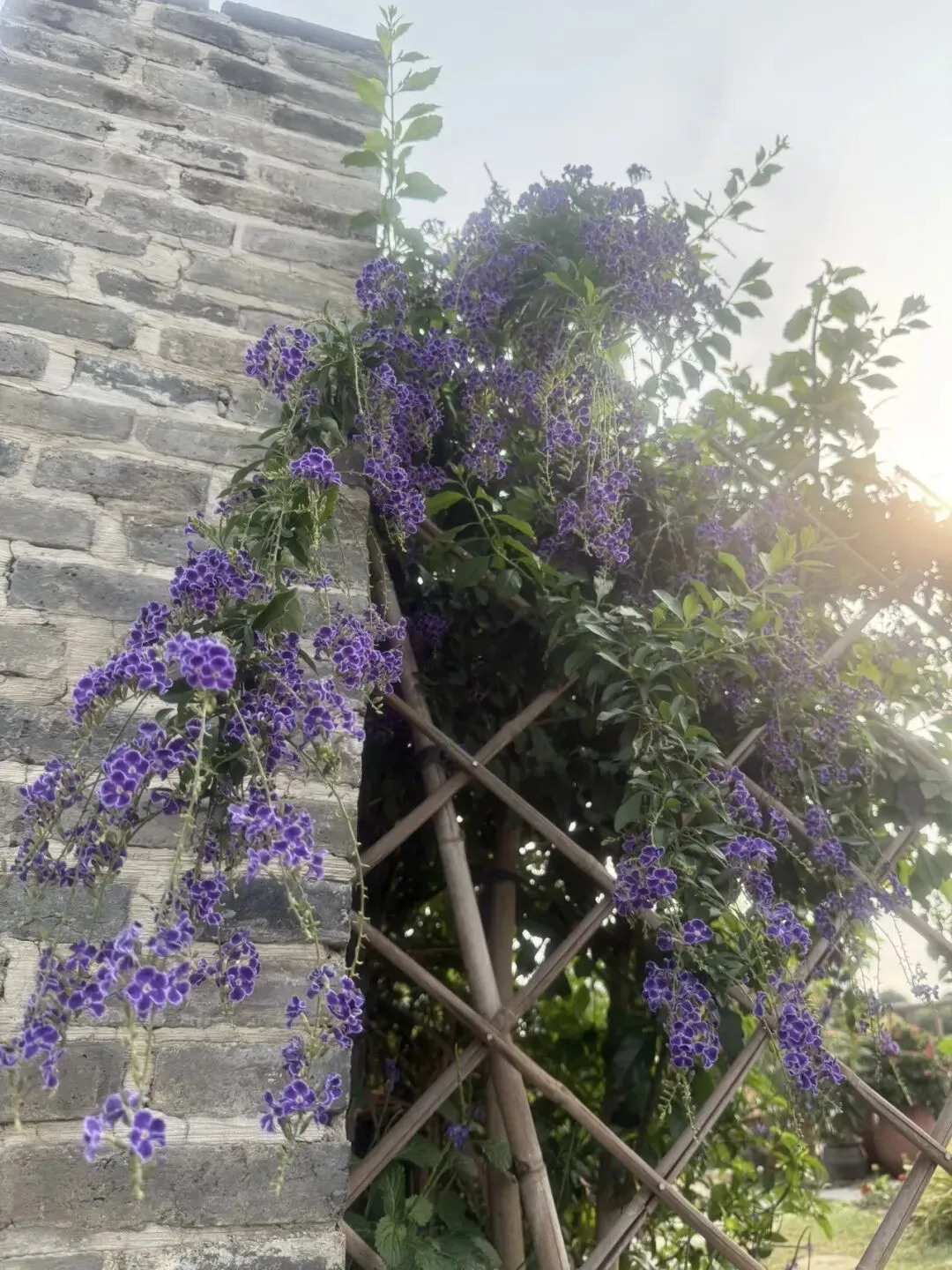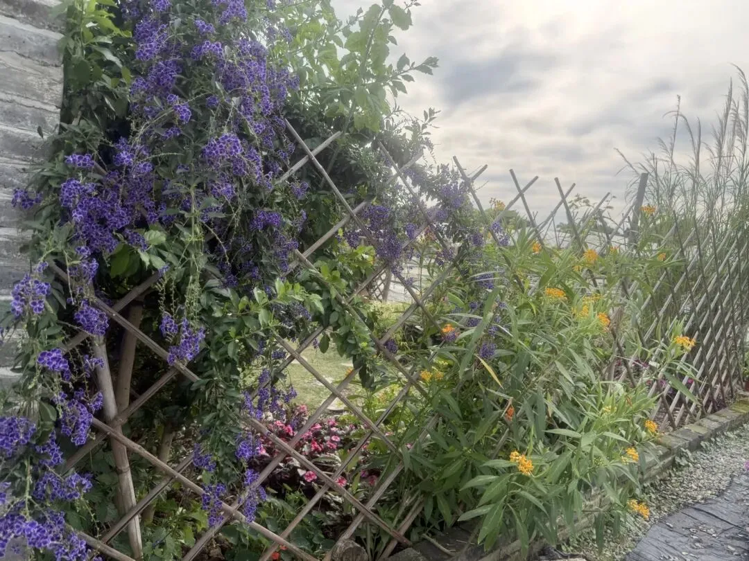 花藤、青砖柱子和竹篱笆,丝丝夕阳,微风细吹,花影摇摇,竟然像一场紫蓝色的梦。