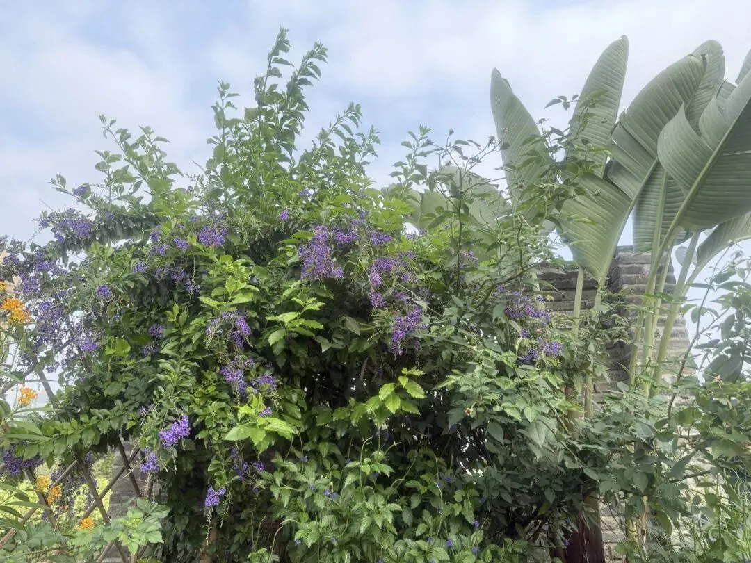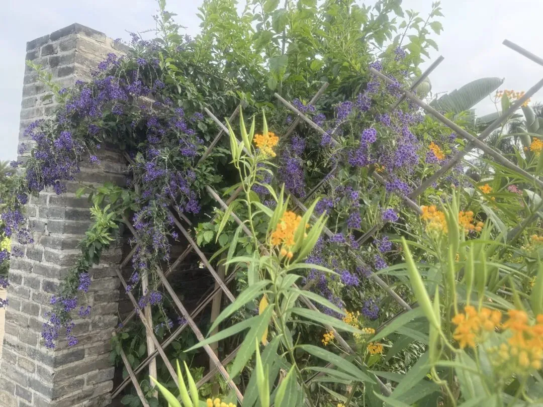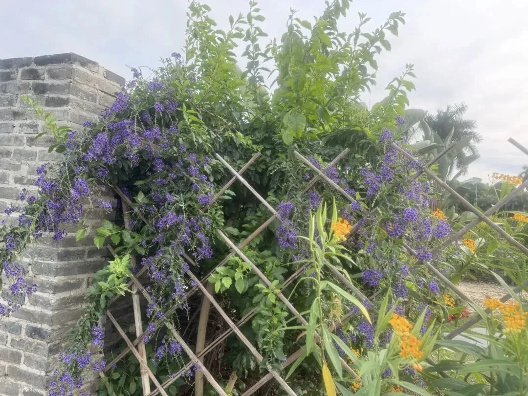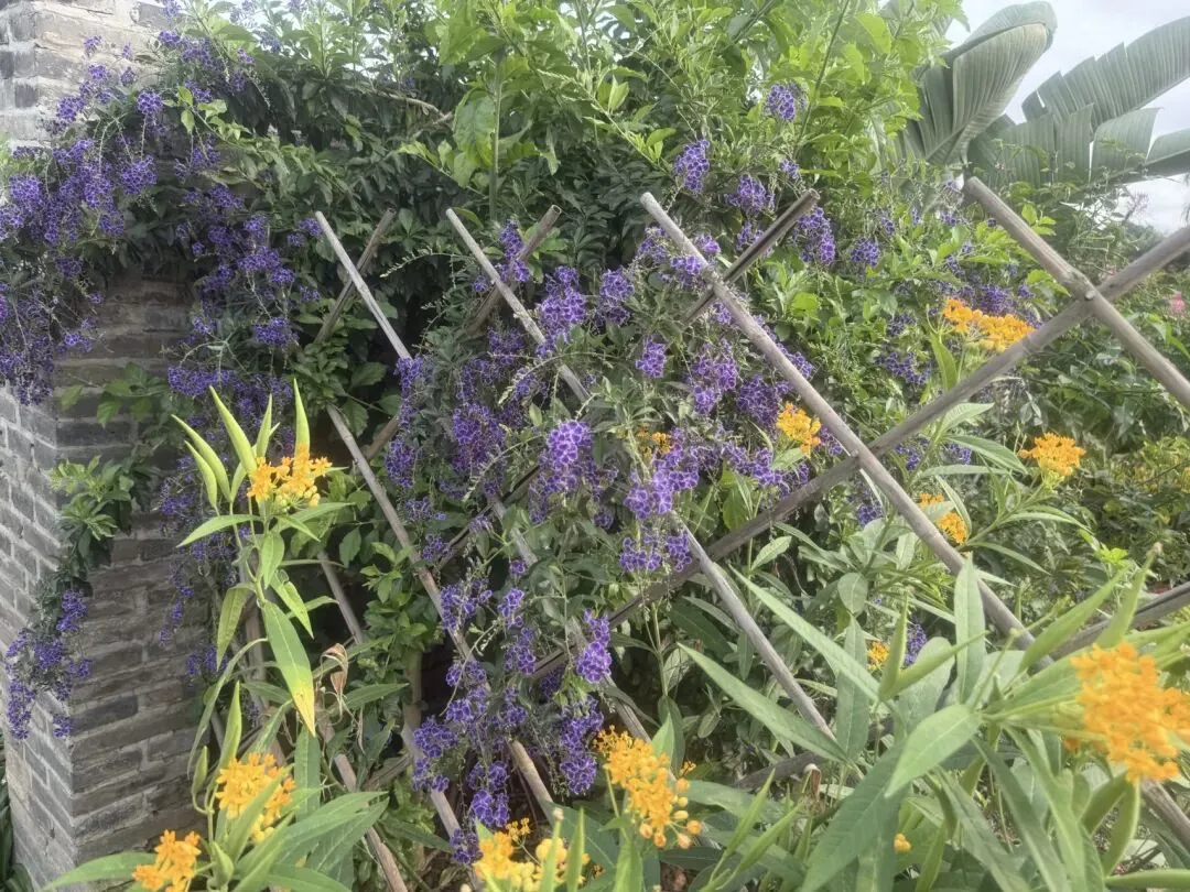花藤、青砖柱子和竹篱笆,丝丝夕阳,微风细吹,花影摇摇,竟然像一场紫蓝色的梦。